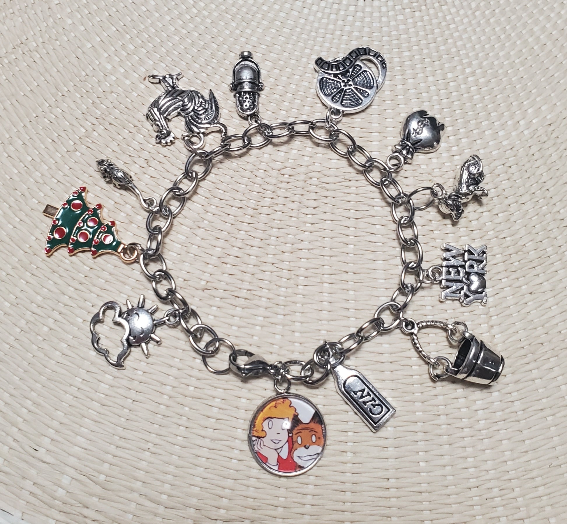 Dieses 7,5 Zoll lange Bettelarmband aus silbernen Metallgliedern besteht aus 11 silbernen Metallanhängern und einem runden Glascabachon-Anhänger von einem halben Zoll, die die Geschichte von ANNIE erzählen! Dieser Artikel ist das perfekte Geschenk für Ihre Besetzung, für Künstler am Bühneneingang oder als einzigartiges Andenken an die Premiere oder Abschlussvorstellung. Es ist verpackt und bereit zum Verschenken oder Ausstellen.