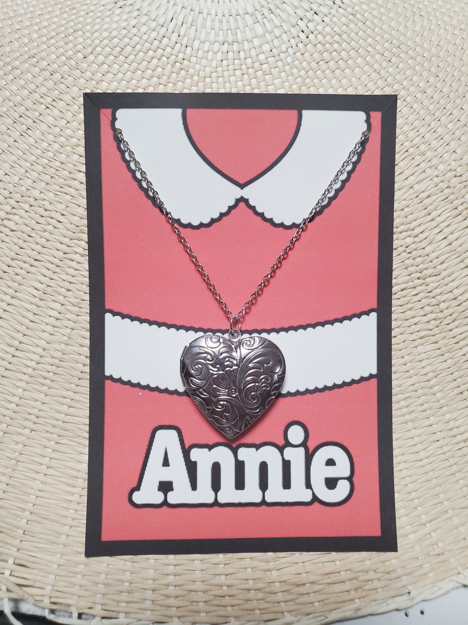 Diese 16 Zoll lange silberne Metallkette mit Herzmedaillon ist ein schönes Andenken an ANNIE! Dieser Artikel ist das perfekte Geschenk für Ihre Besetzung, für Künstler am Bühneneingang oder als einzigartiges Andenken an die Premiere oder die Abschlussvorstellung. Er ist verpackt und bereit zum Verschenken oder Ausstellen.