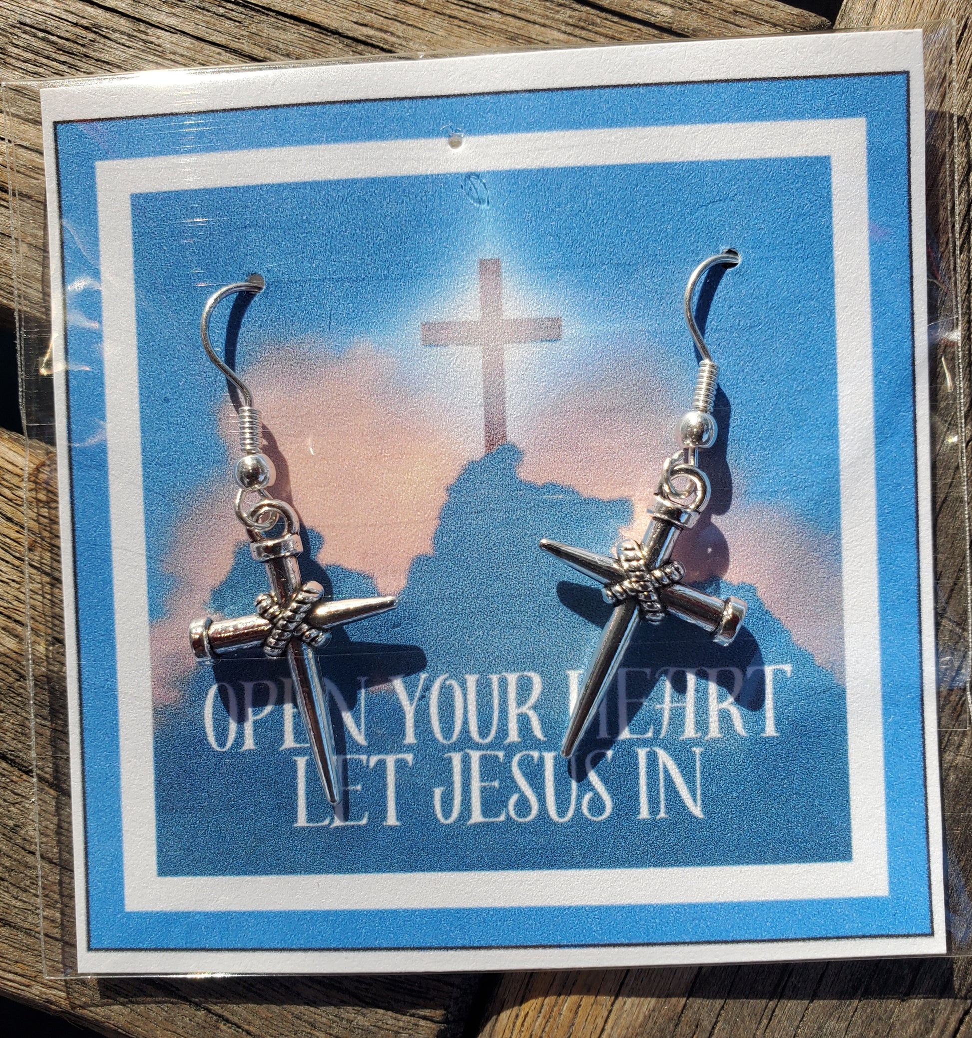 Jeder dieser silbernen Kreuzanhänger scheint aus zusammengebundenen Nägeln zu bestehen und ist 2,5 cm lang und ungefähr 1,9 cm breit. Sie hängen an silbernen Angelhaken-Ohrringen aus Metall. Sie sind auf Karten mit der Aufschrift „Öffne dein Herz, lass Jesus herein“ verpackt und können ausgestellt oder verschenkt werden. Dieser Artikel ist das perfekte Geschenk für Ihre Besetzung, für Darsteller am Bühneneingang oder als einzigartiges Andenken an die Premiere oder die Abschlussvorstellung.
