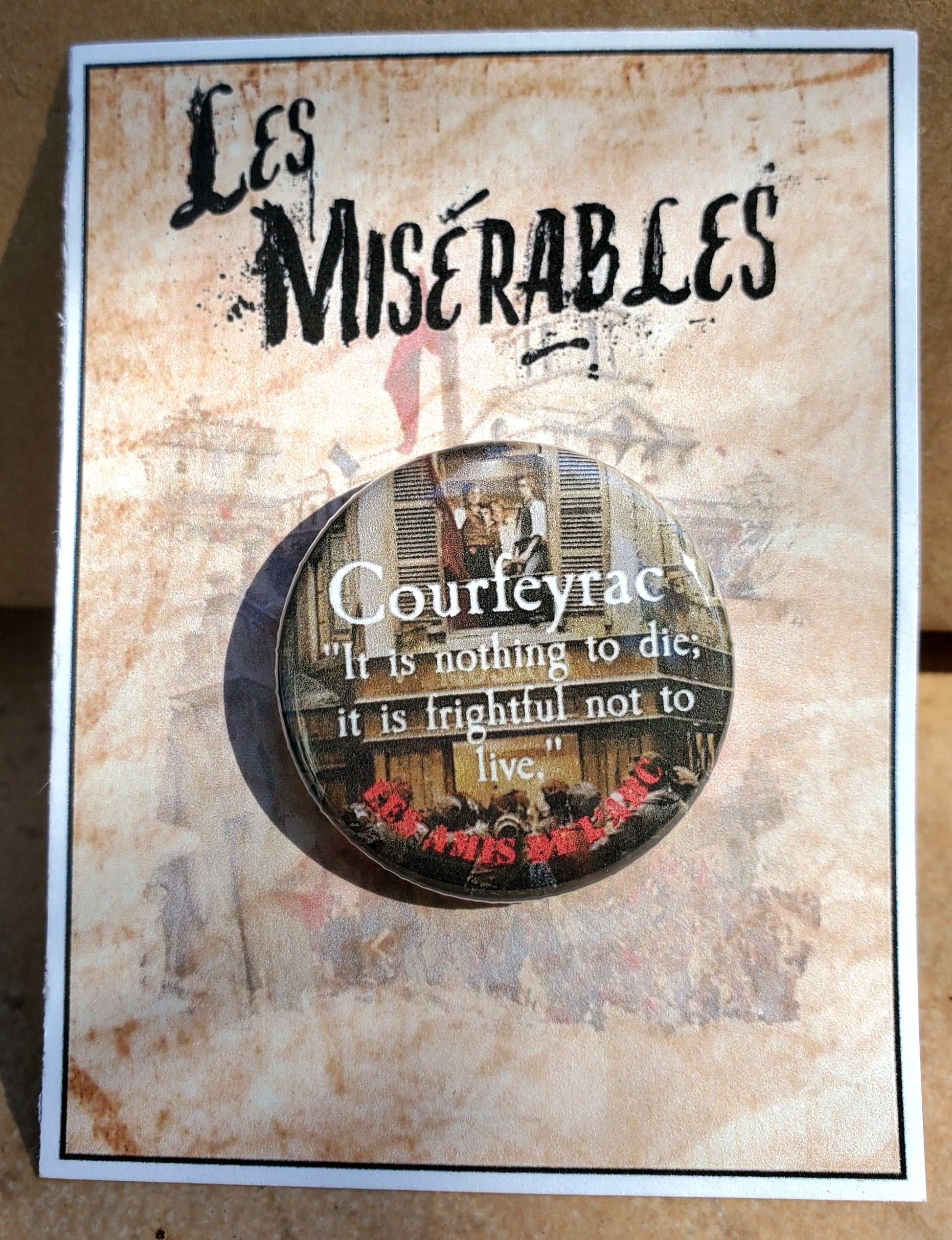 Auf dieser Anstecknadel ist der Schüler „Courfeyrac“ zusammen mit einem seiner Zitate aus dem Roman abgebildet. Dieser Artikel eignet sich perfekt als Geschenk für die Besetzung, als Dankeschön, als Geschenk zur Eröffnung oder zum Abschluss einer Show, als Geschenk an der Bühnentür oder als Andenken für das Publikum oder die Fans des Buches, Musicals und der Filme.