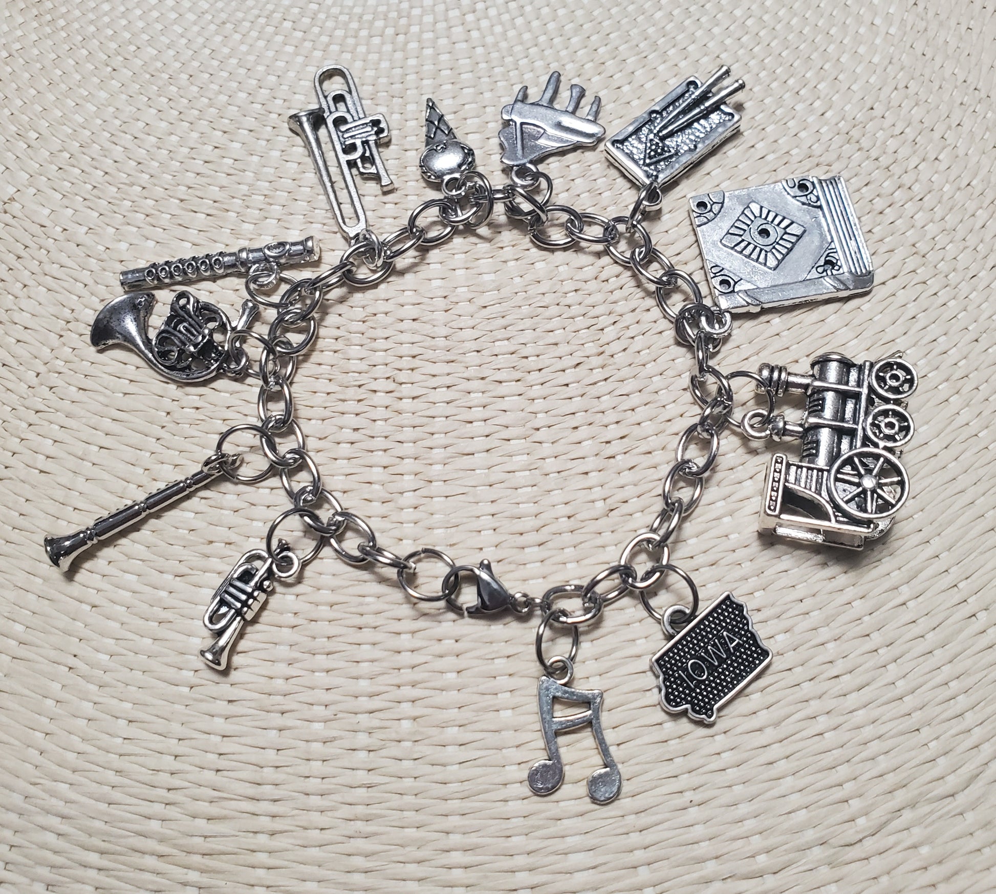 Dieses 7,5 Zoll lange silberne Metallgliederarmband besteht aus 11 silbernen Metallanhängern und einem runden Glascabachonanhänger von einem halben Zoll, die die Geschichte von Harold Hill, dem Music Man, erzählen! Dieser Artikel ist das perfekte Geschenk für Ihre Besetzung, für Künstler an der Bühnentür oder als einzigartiges Andenken an die Premiere oder eine Abschlussvorstellung. Es ist verpackt und bereit zum Verschenken oder Ausstellen.