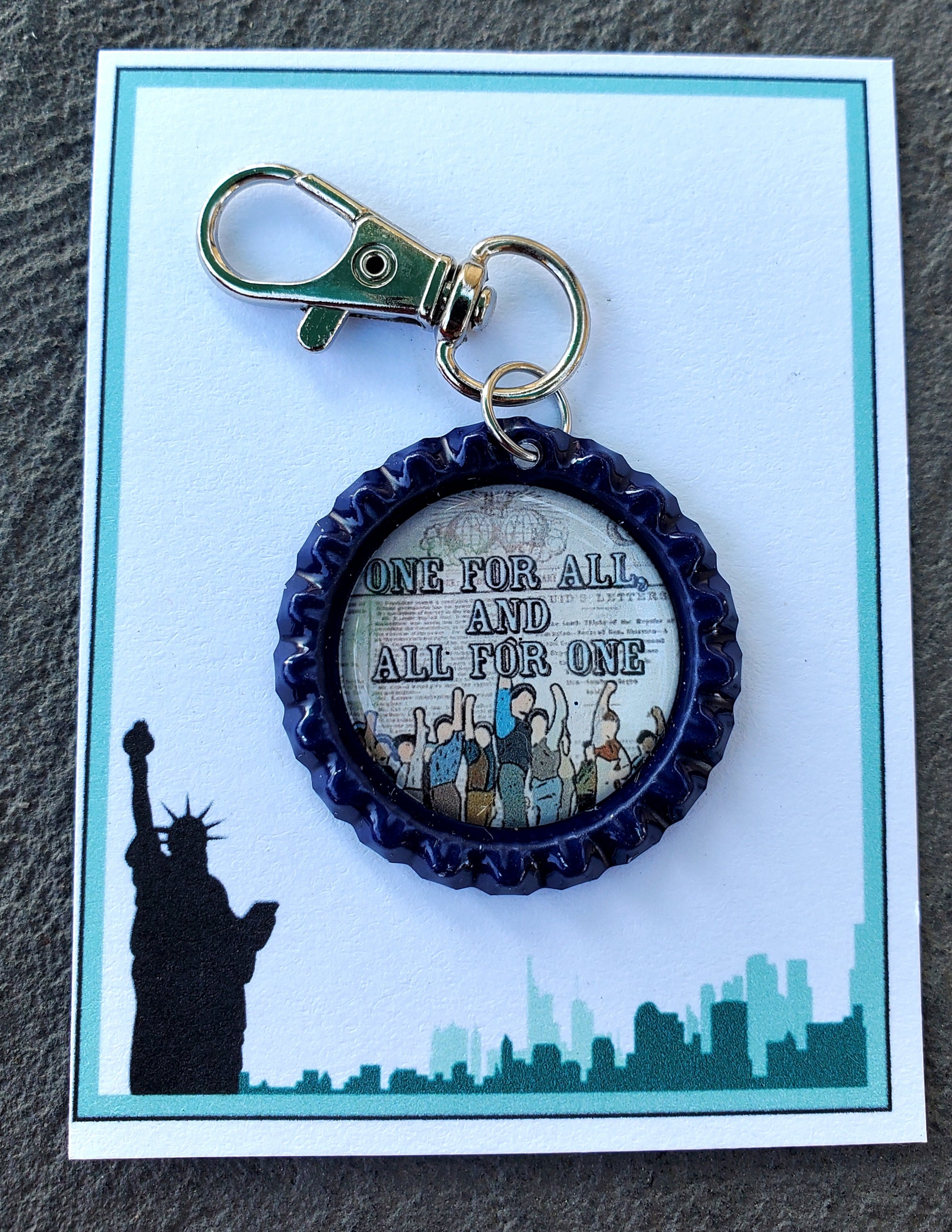 Der mitreißende Text „Einer für alle, alle für einen!“ ist auf diesem Schlüsselanhänger aus Kronkorken zu finden! Er ist das perfekte Geschenk für Ihre Besetzung, für Darsteller am Bühneneingang oder als einzigartiges Andenken an die Premiere oder die Abschlussvorstellung.
