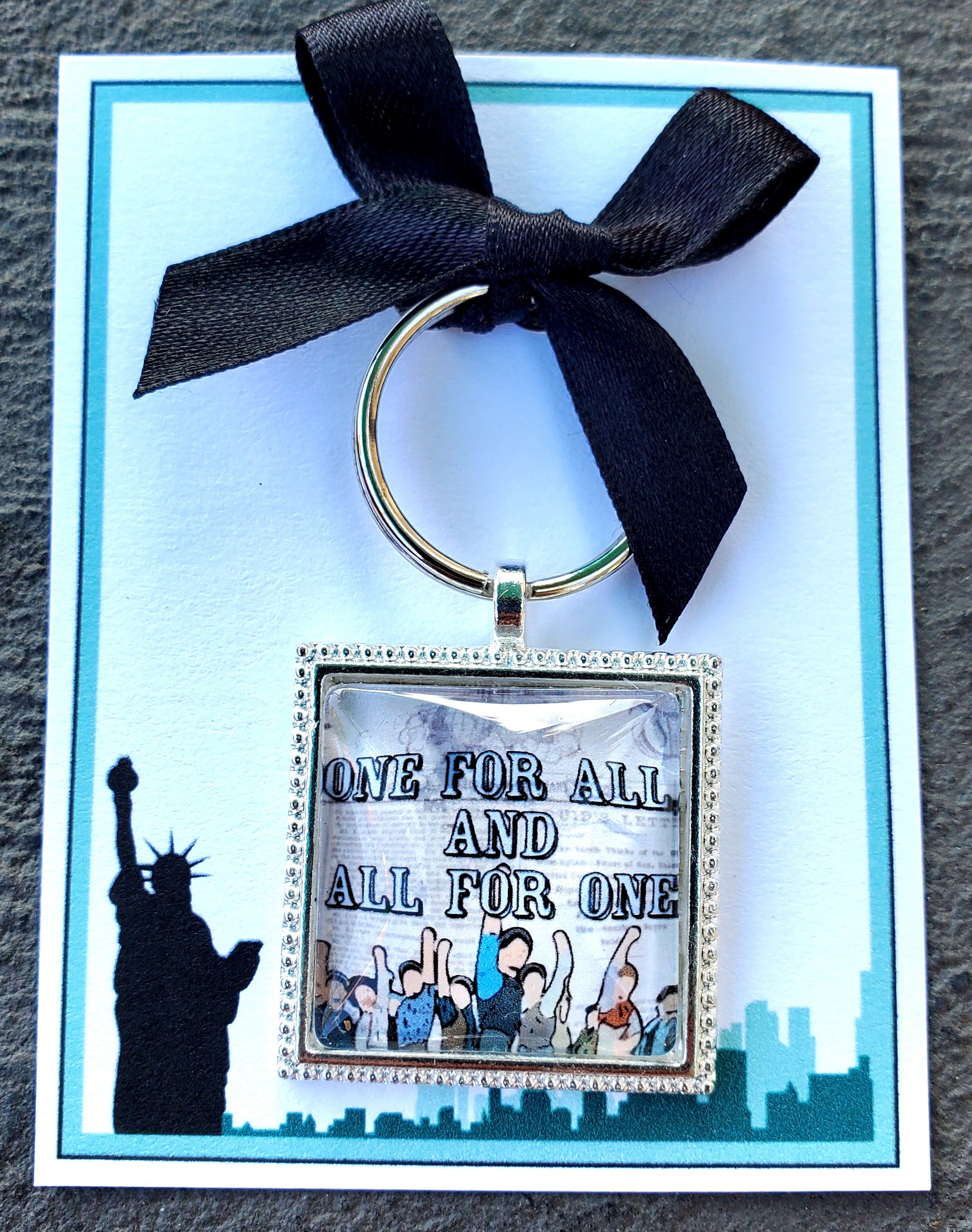 "Einer für alle, alle für einen!" Der mitreißende Text ist auf diesem Schlüsselanhänger mit Glascabachon-Anhänger zu finden! Er ist das perfekte Geschenk für Ihre Besetzung, für Künstler am Bühneneingang oder als einzigartiges Andenken an die Premiere oder die Abschlussvorstellung.