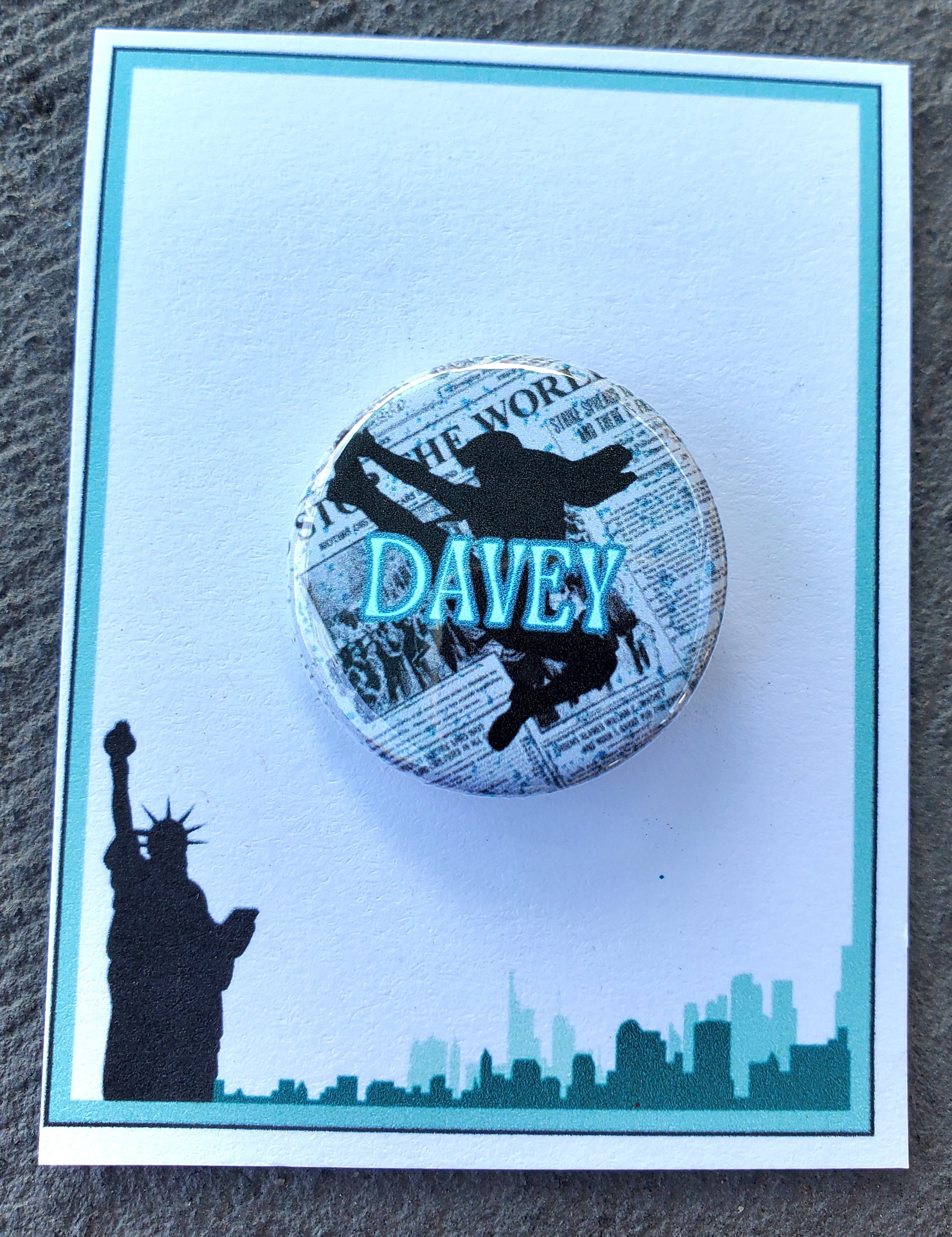 Davey, der große Bruder von Les und der neueste Newsie, ist auf diesem Metall-Anstecker abgebildet. Er ist das perfekte Geschenk für Ihre Besetzung, für Darsteller am Bühneneingang oder als einzigartiges Andenken an die Premiere oder die Abschlussvorstellung.