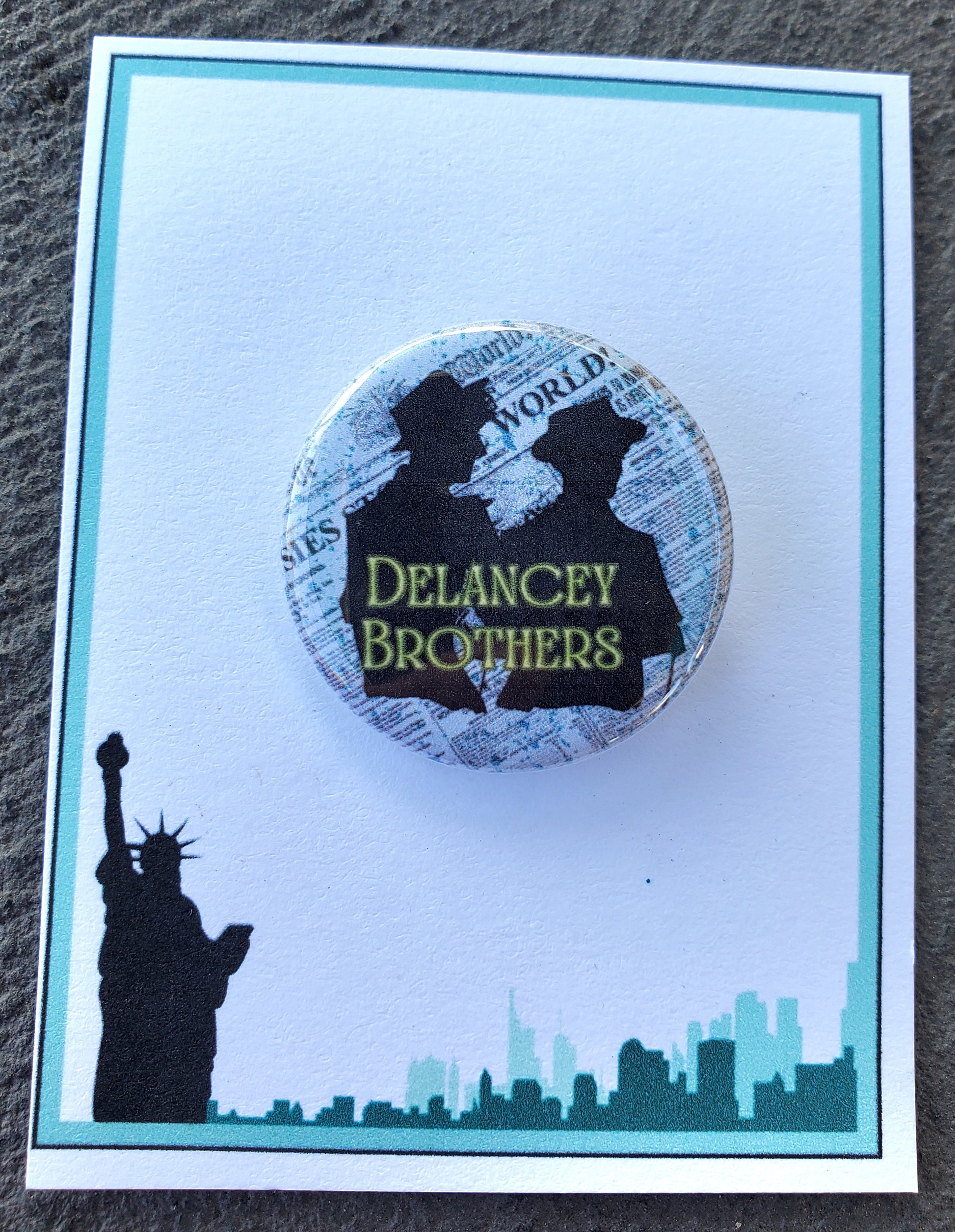 Die Delancey Brothers, die am Distributionsschalter von The World arbeiten, sind auf diesem Metall-Anstecker abgebildet. Er ist das perfekte Geschenk für Ihre Besetzung, für Darsteller am Bühneneingang oder als einzigartiges Andenken an die Premiere oder die Abschlussvorstellung.