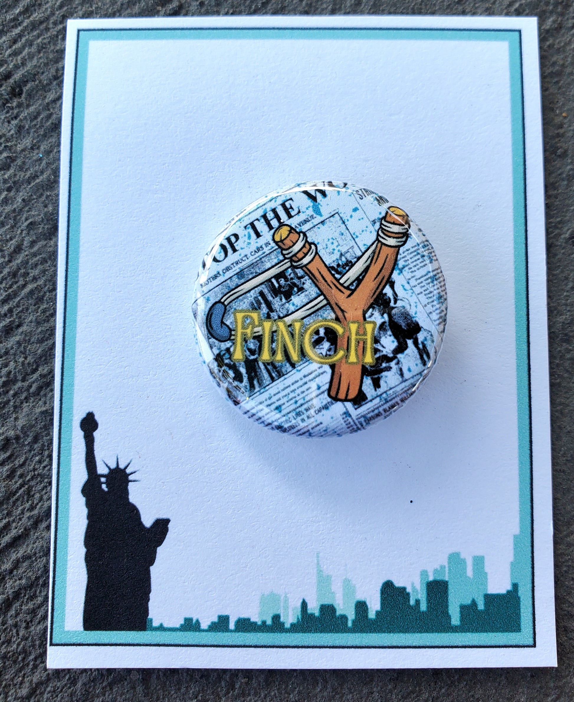 Newsie Finch ist auf diesem Anstecker aus Metall abgebildet. Er ist das perfekte Geschenk für Ihre Besetzung, für Darsteller am Bühneneingang oder als einzigartiges Andenken an die Premiere oder die Abschlussvorstellung.