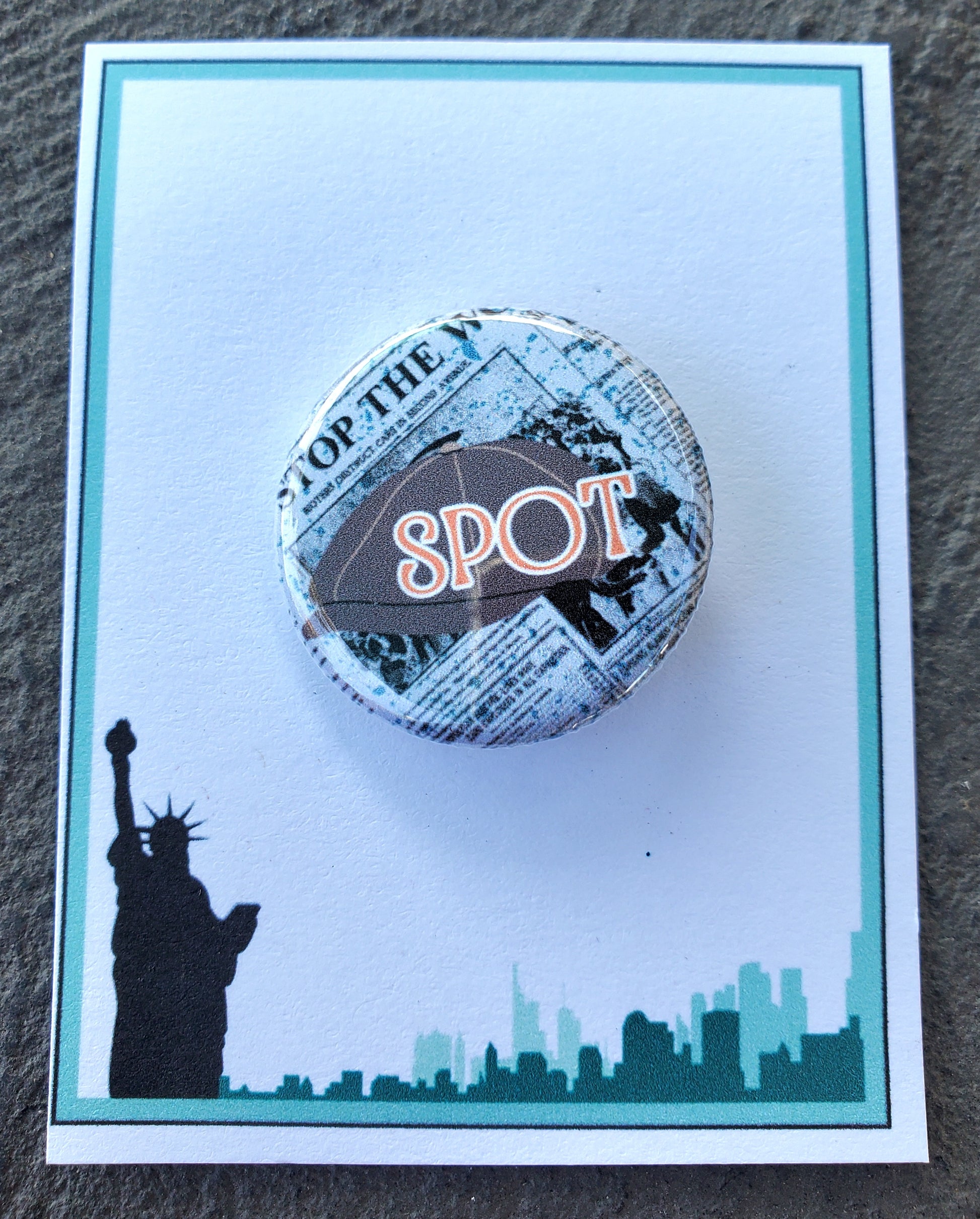 Spot Conlon, der Anführer der Brooklyn Newsies, ist auf diesem Metall-Anstecker abgebildet. Er ist das perfekte Geschenk für Ihre Besetzung, für Künstler am Bühneneingang oder als einzigartiges Andenken an die Premiere oder die Abschlussvorstellung.