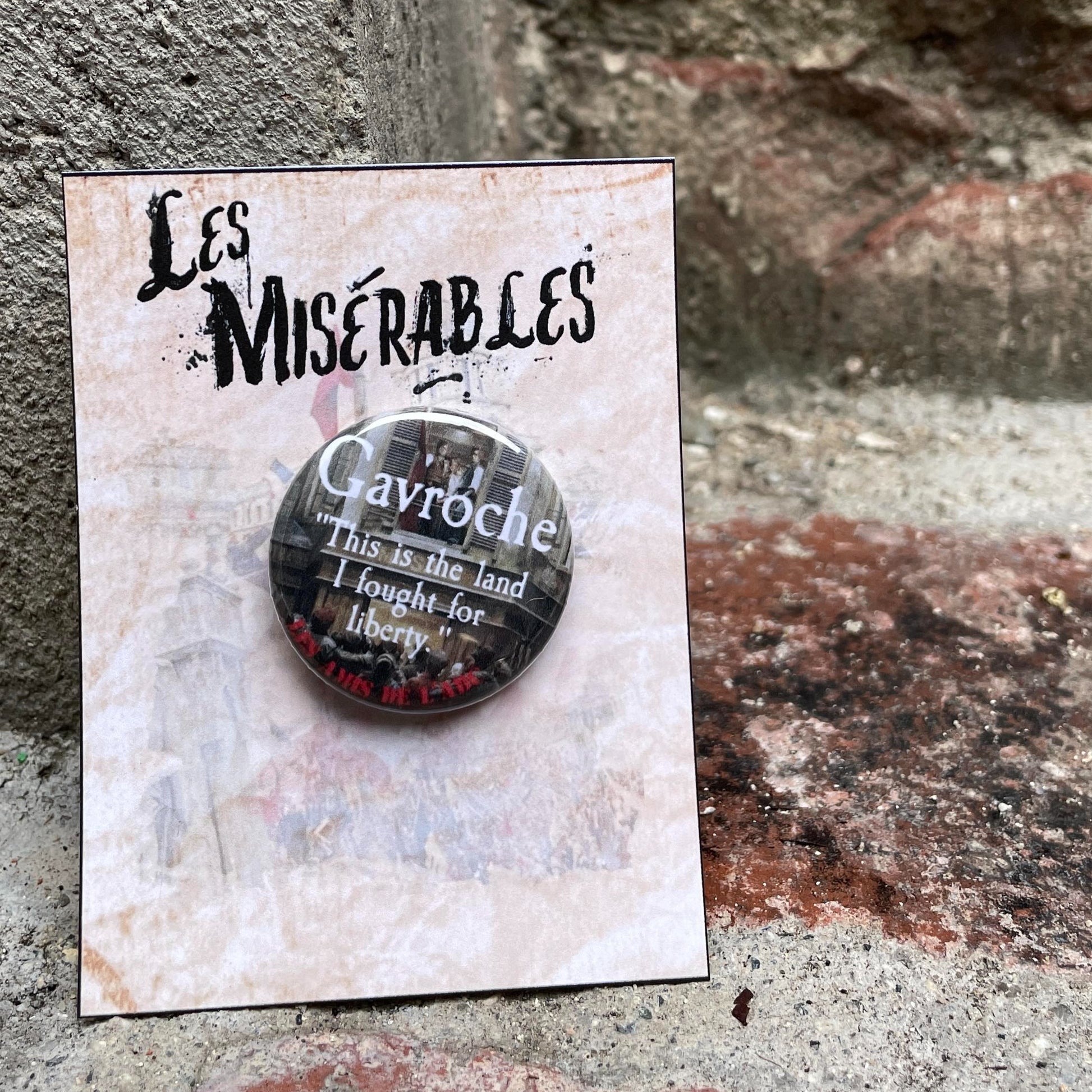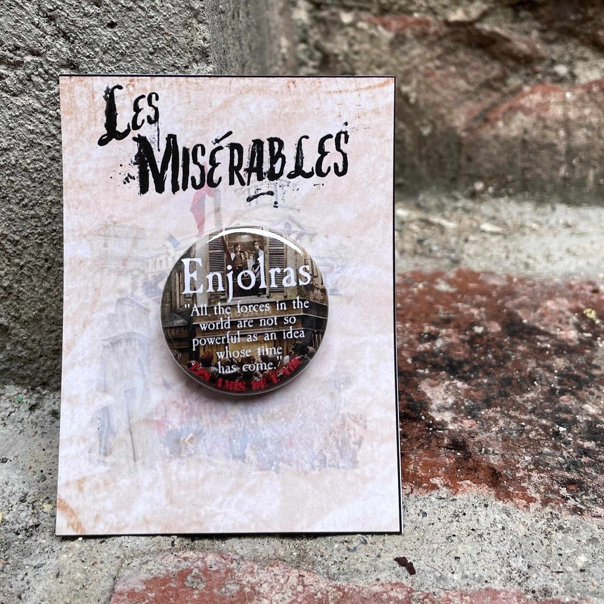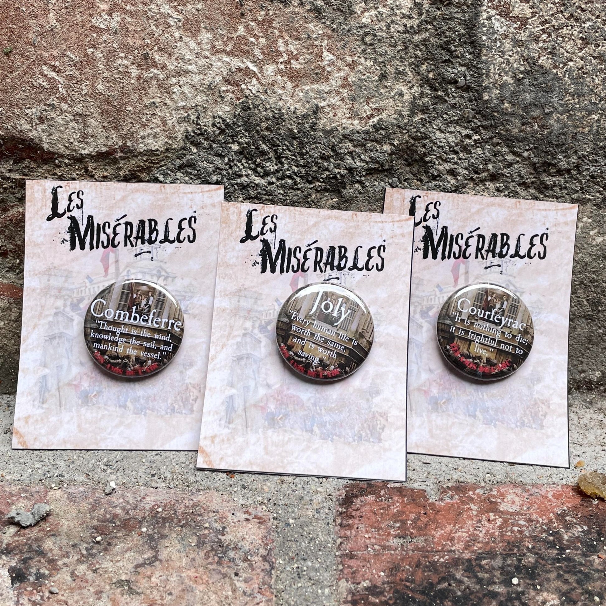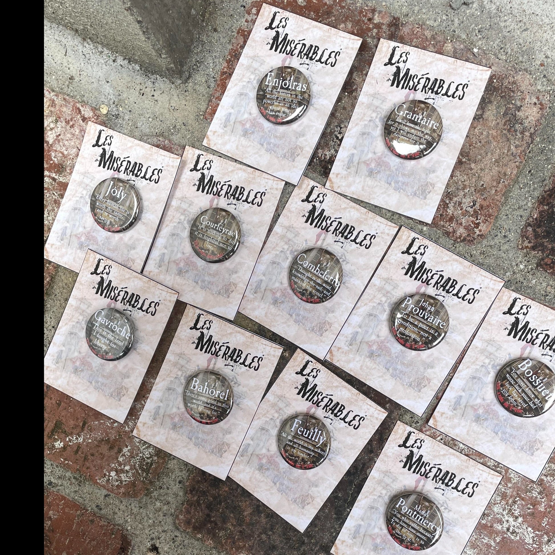 This bundle honors each of the lead Boys who fought together on the Barricade. Each pin features the name of a Barricade Boy along with a quote from the famous novel attributed to him. "Liberté, Égalité, Fraternité!"