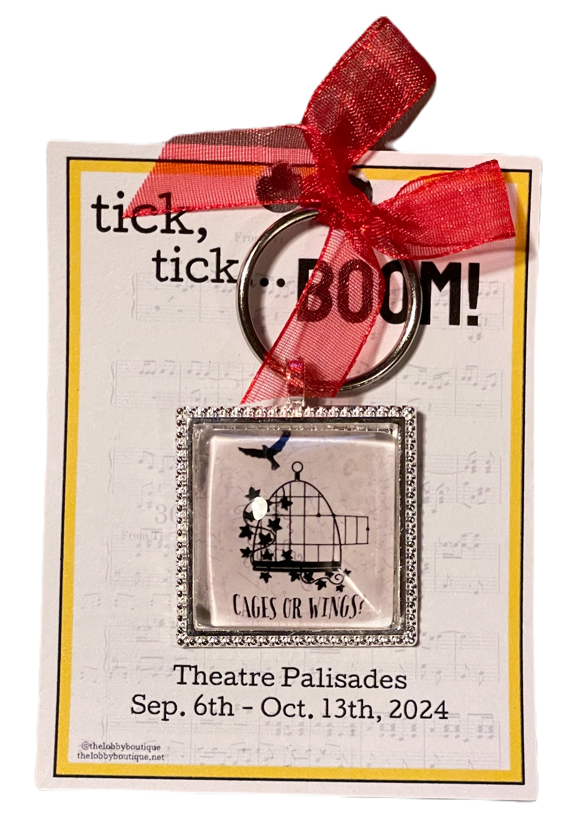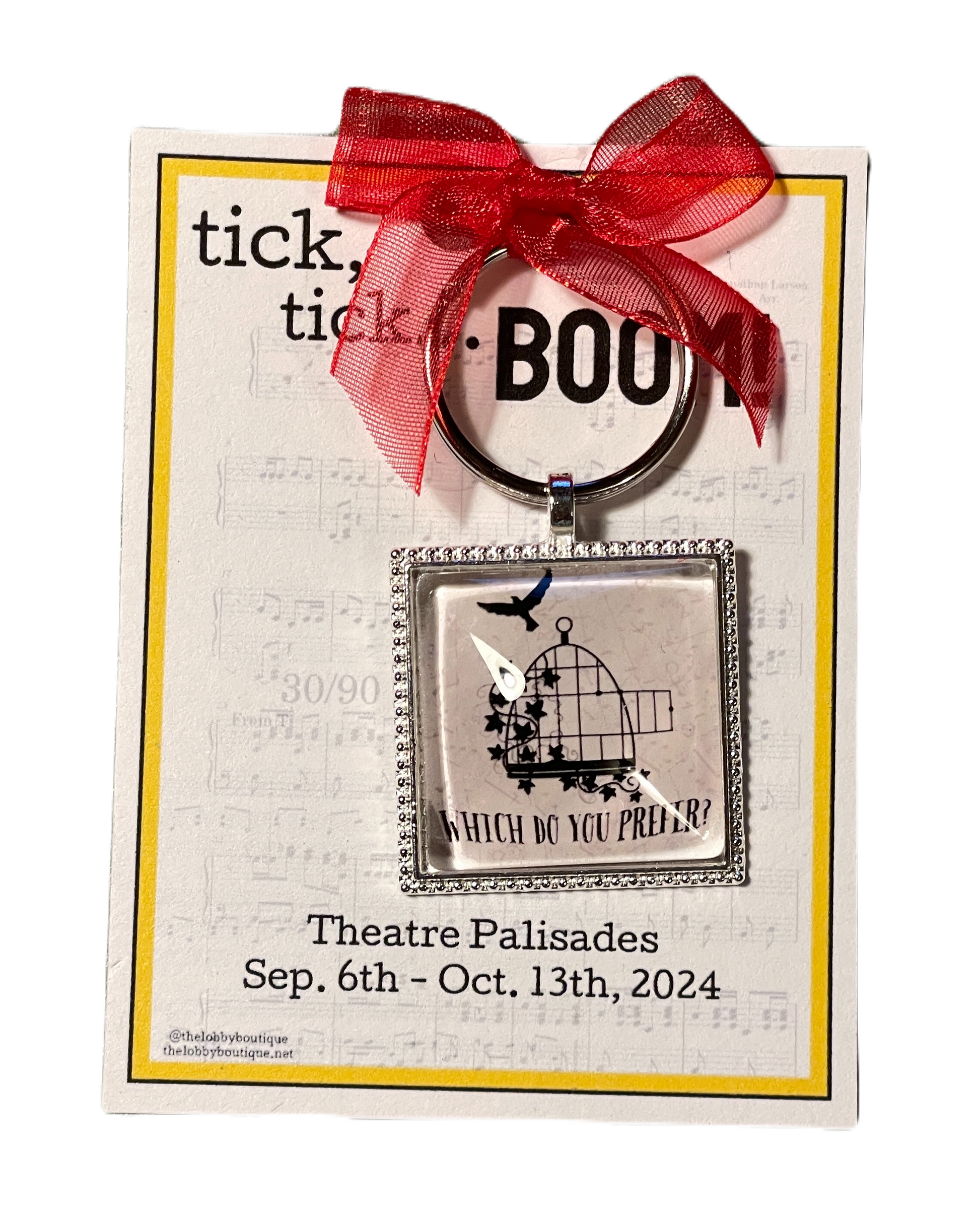 Inspired by the musical TICK, TICK... BOOM!, originally designed artwork from the song "Louder than Words" is featured on this beautiful glass cabochon pendant keychain. It makes the perfect gift for your cast, for performers at a stage door, or as a unique memento for opening night or a final performance. The pendant is one inch square, attached to a silver metal split ring and packaged on a card for easy display and gift-giving.