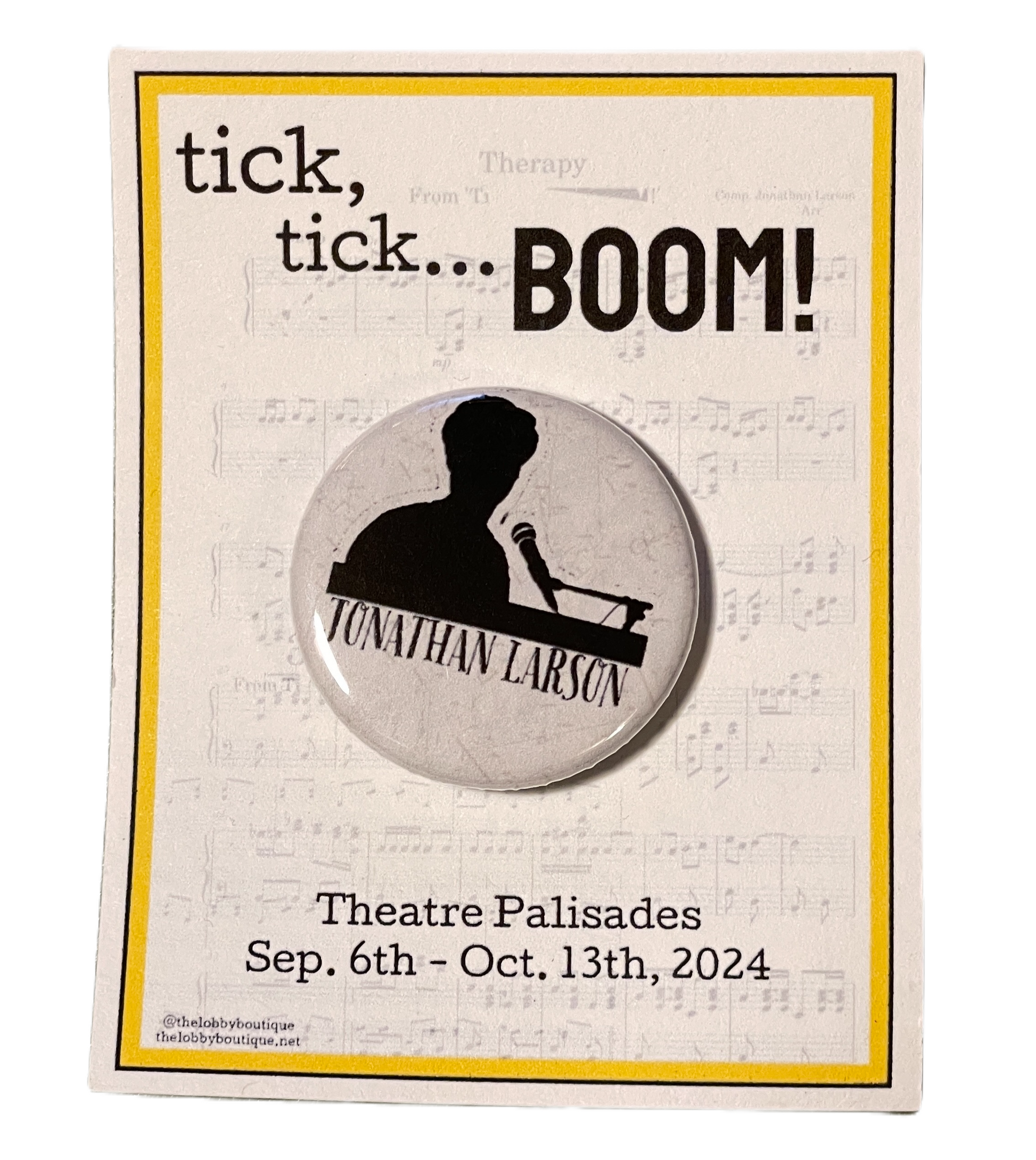 Inspired by Jonathan Larson's beloved autobiographical musical TICK, TICK... BOOM, this pin features an image of the late playwright and composer in his natural habitat, the piano. It makes the perfect cast gift, for performers at a stage door, or as a unique memento for opening night or a final performance. It is packaged and ready for gift-giving or display.