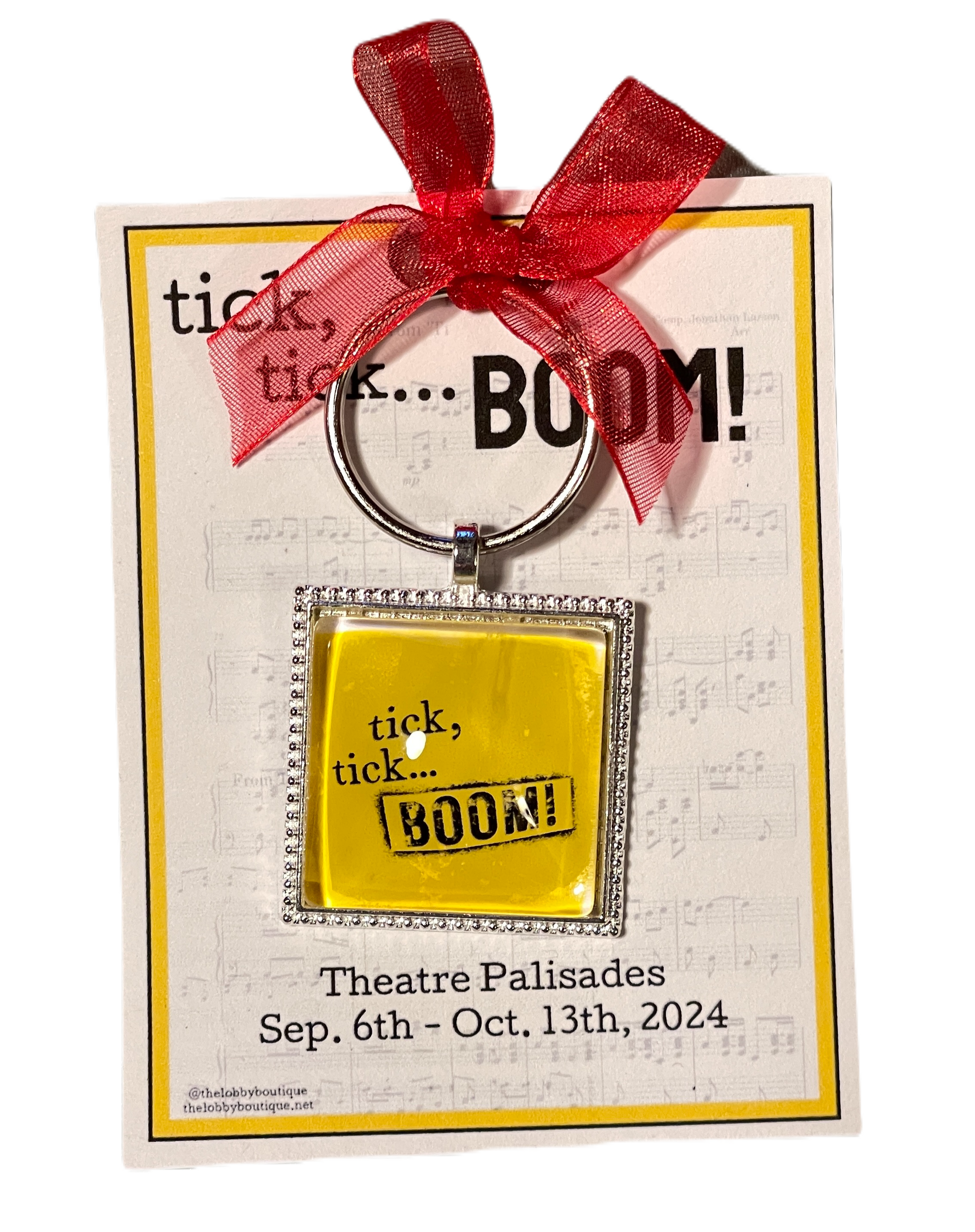 Inspired by the musical TICK, TICK... BOOM!, this originally designed show logo is featured on this beautiful glass cabochon pendant keychain. It makes the perfect gift for your cast, for performers at a stage door, or as a unique memento for opening night or a final performance. The pendant is one inch square, attached to a silver metal split ring and packaged on a card for easy display and gift-giving.