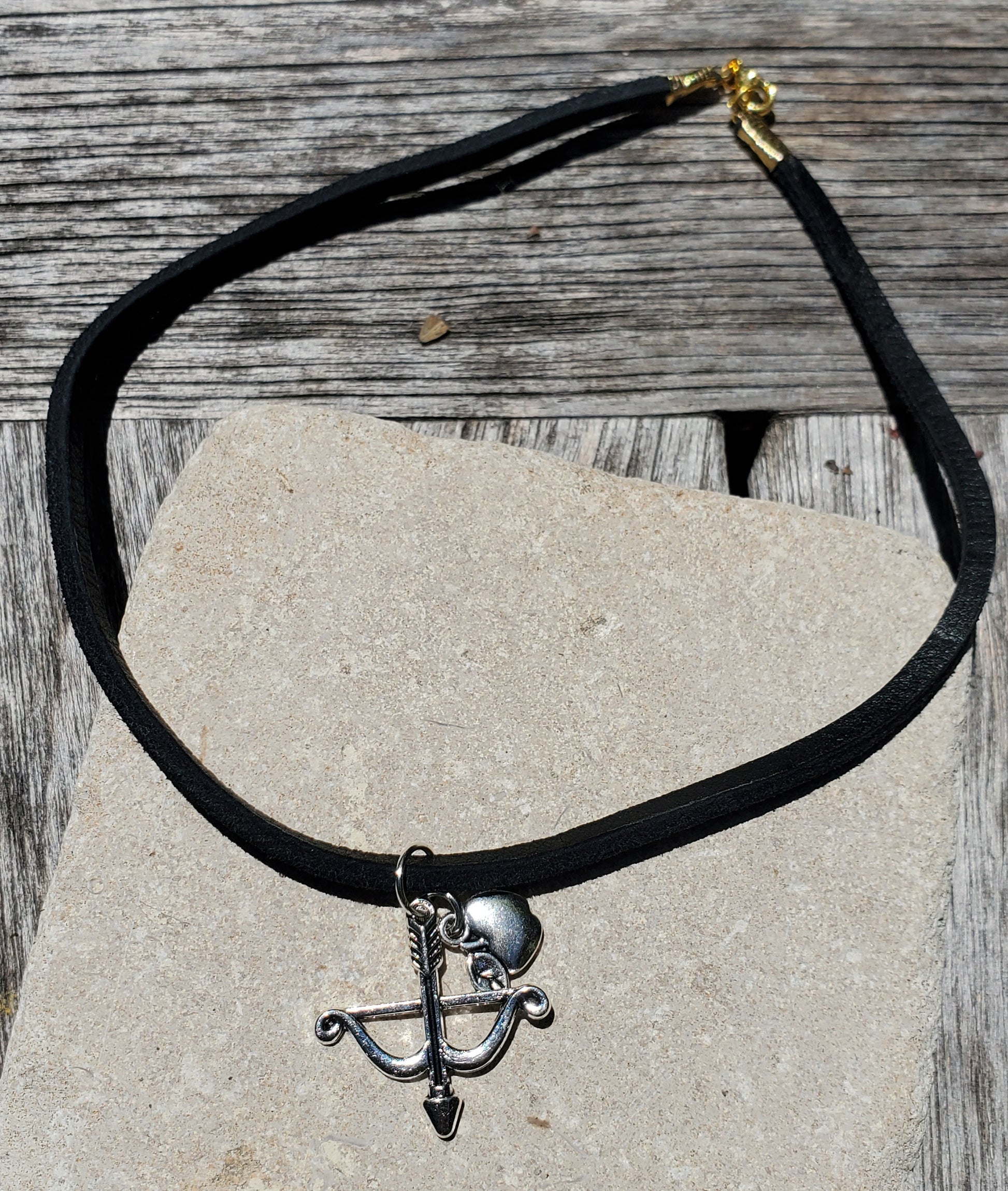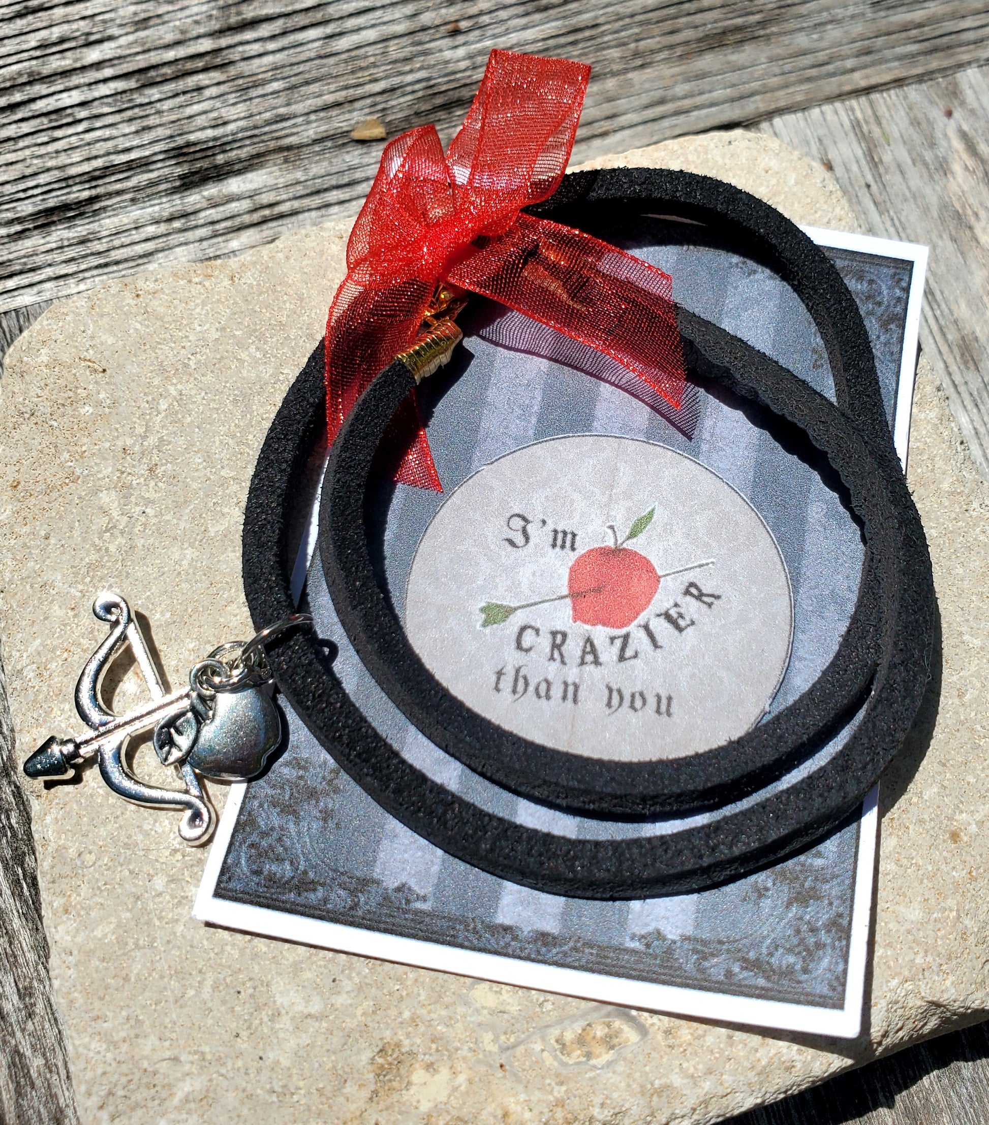 This 14 inch black leather choker features Wednesday's crossbow and apple charms which which are symbols of her Crazier Than You love for Lucas Beineke! This item makes the perfect gift for your cast, for performers at a stage door, or as a unique memento for opening night or a final performance. It is packaged and ready for gift-giving or display.