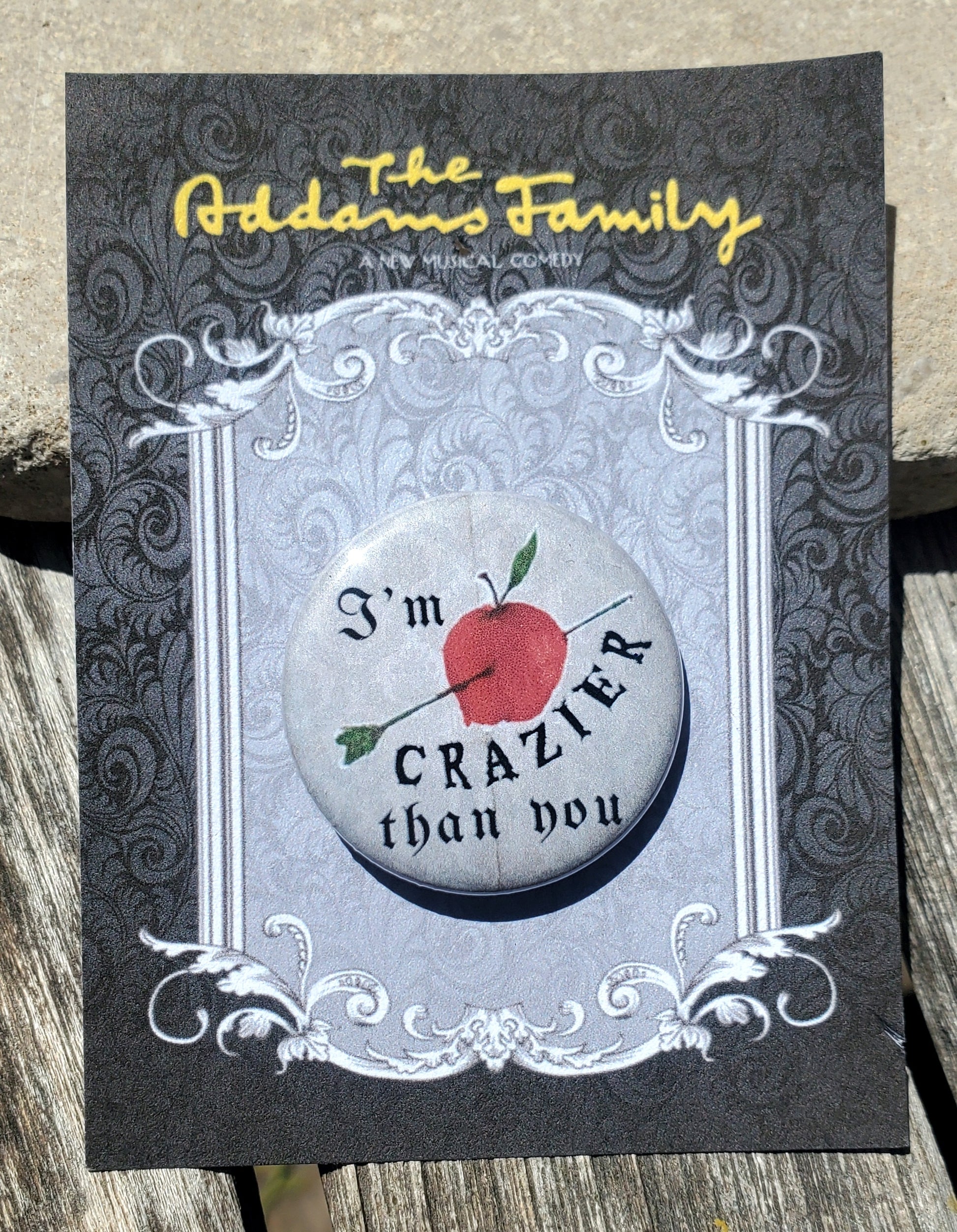 "I'm Crazier Than You!" sing Wednesday and Lucas to each other! Inspired by ADDAMS FAMILY the musical, this pin makes the perfect cast gift, for performers at a stage door, or as a unique memento for opening night or a final performance. It is packaged and ready for gift-giving or display.