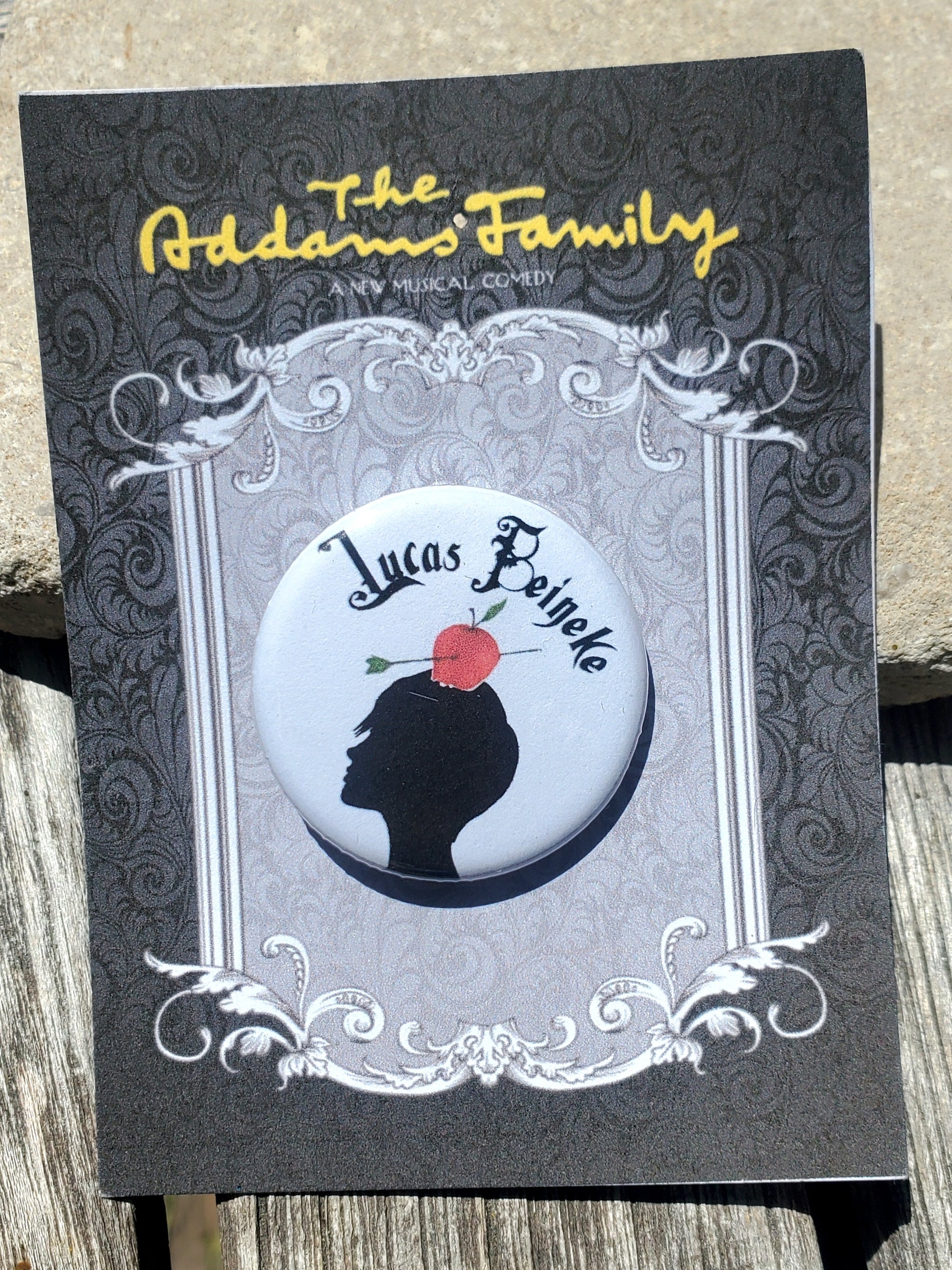 Inspired by ADDAMS FAMILY the musical, this pin features the character "Lucas Beineke." It makes the perfect cast gift, for performers at a stage door, or as a unique memento for opening night or a final performance. It is packaged and ready for gift-giving or display.