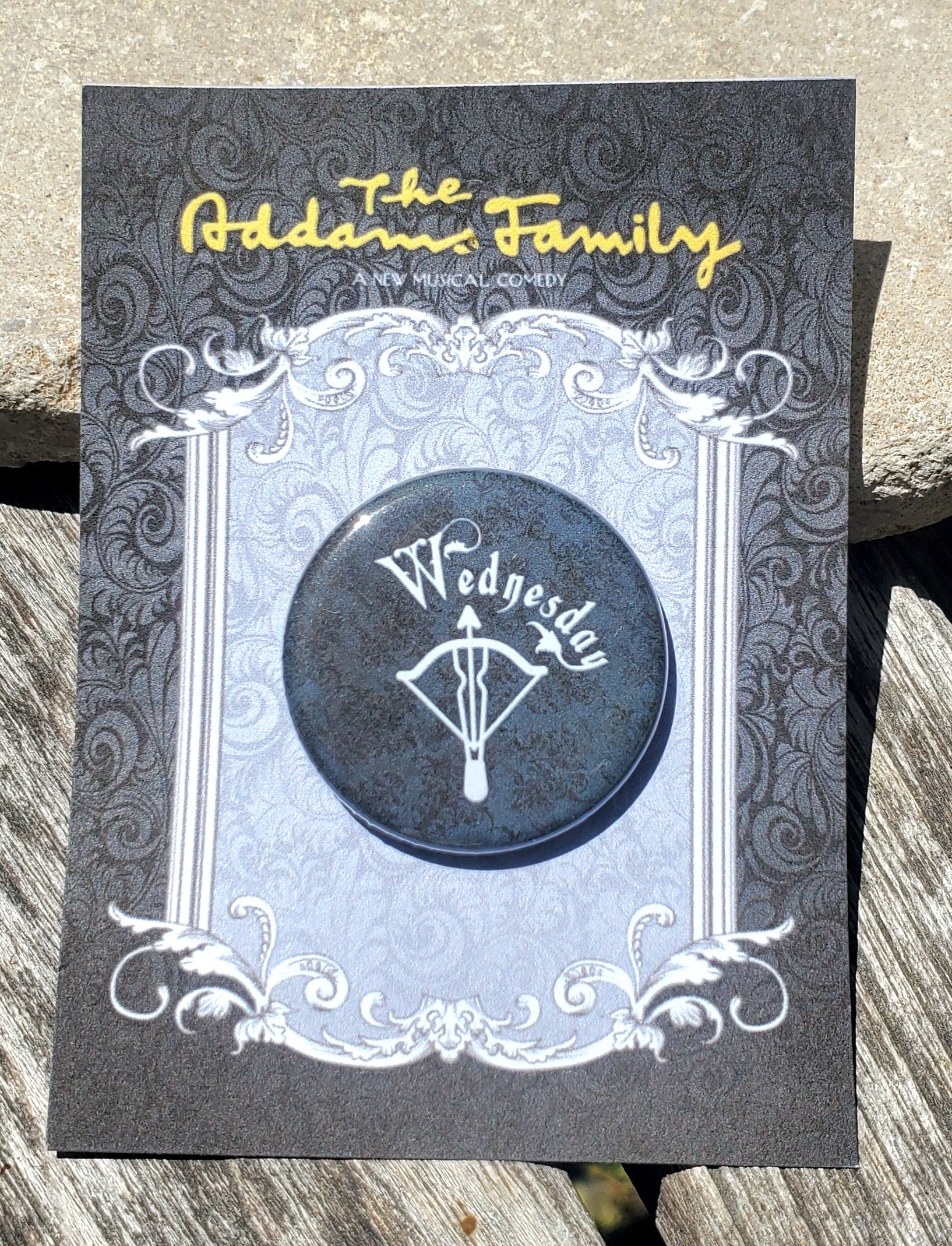 Inspired by ADDAMS FAMILY the musical, this pin features the lead character "Wednesday." It makes the perfect cast gift, for performers at a stage door, or as a unique memento for opening night or a final performance. It is packaged and ready for gift-giving or display.
