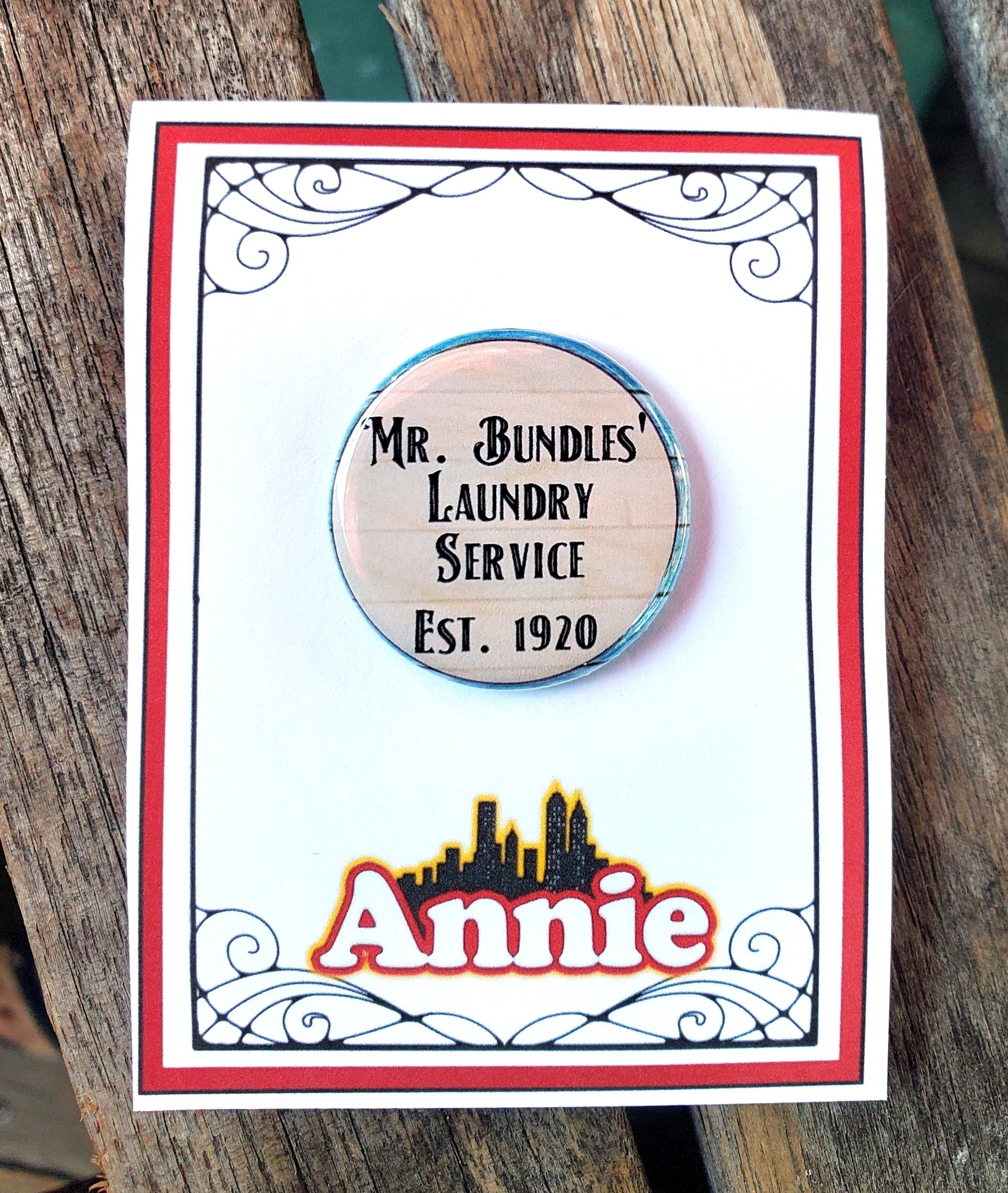 Inspired by "ANNIE" the musical and movie, this colorful pin features "Mr. Bundles." It makes the perfect gift for your cast, for performers at a stage door, or as a unique memento for opening night or a final performance. It is packaged and ready for gift-giving or display.