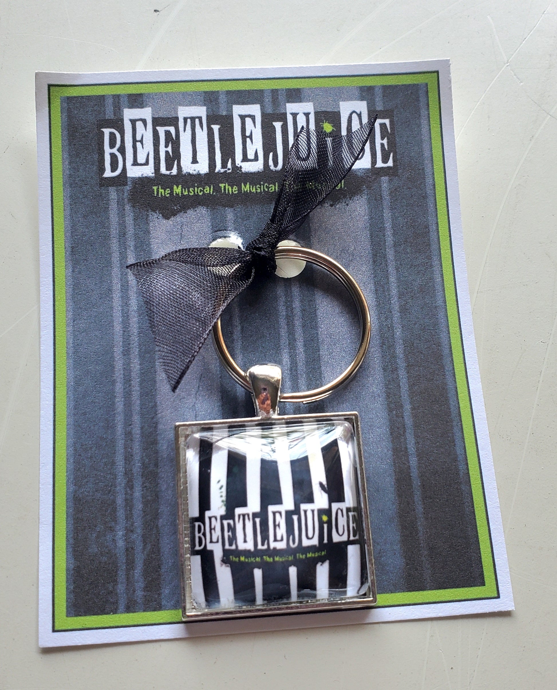 This one inch square pendant features a fun show logo graphic inspired by the musical BEETLEJUICE. The pendant and graphic are topped with a one inch square glass cabachon and are attached to a sturdy silver metal one inch split rin. This item makes the perfect gift for your cast, for performers at a stage door, or as a unique memento for opening night or a final performance. It is carded and ready for gift-giving or display.