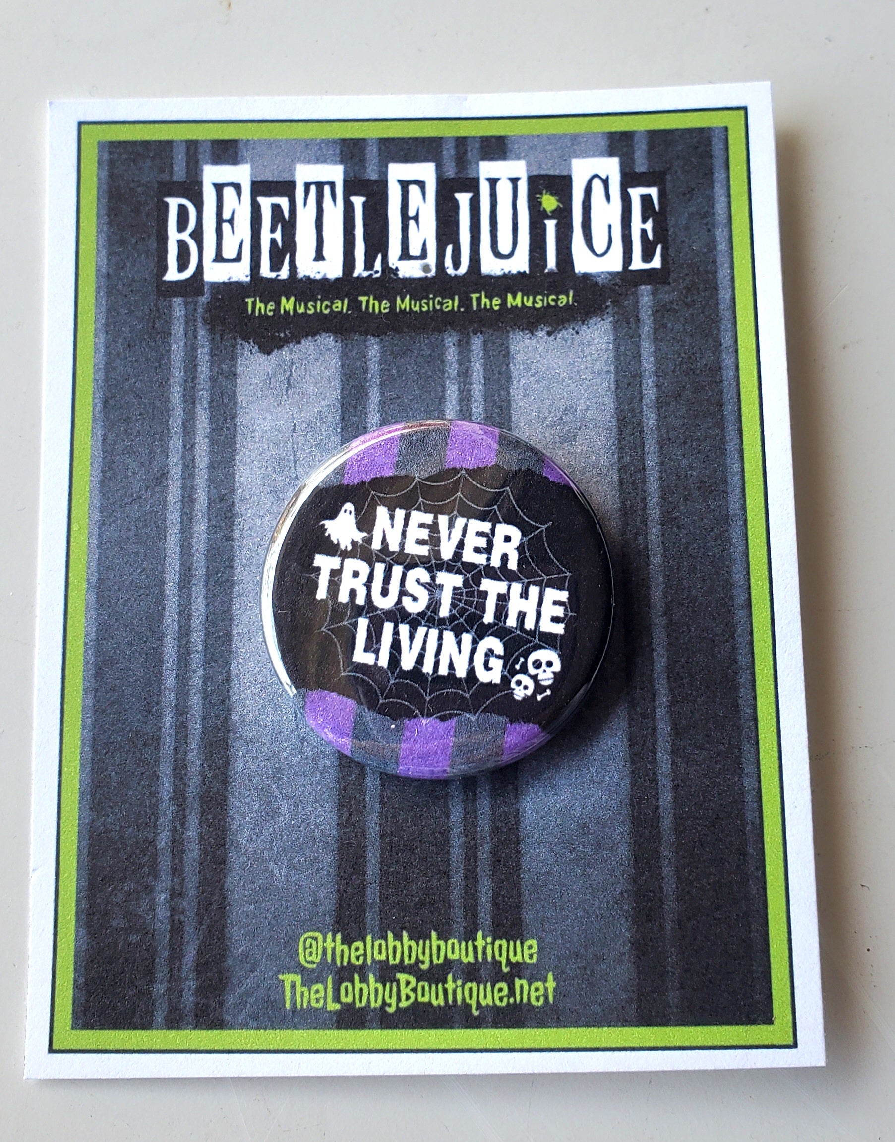 Inspired by the hit musical "BEETLEJUICE," the musical, this metal pinback button features the line "Never Trust the Living." It makes the perfect cast gift, or for performers at the stage door, or as a unique memento for opening night or a final performance. The pin measures 1.25 inches across and it comes attached to an originally designed card, packaged and ready for gift-giving or display.