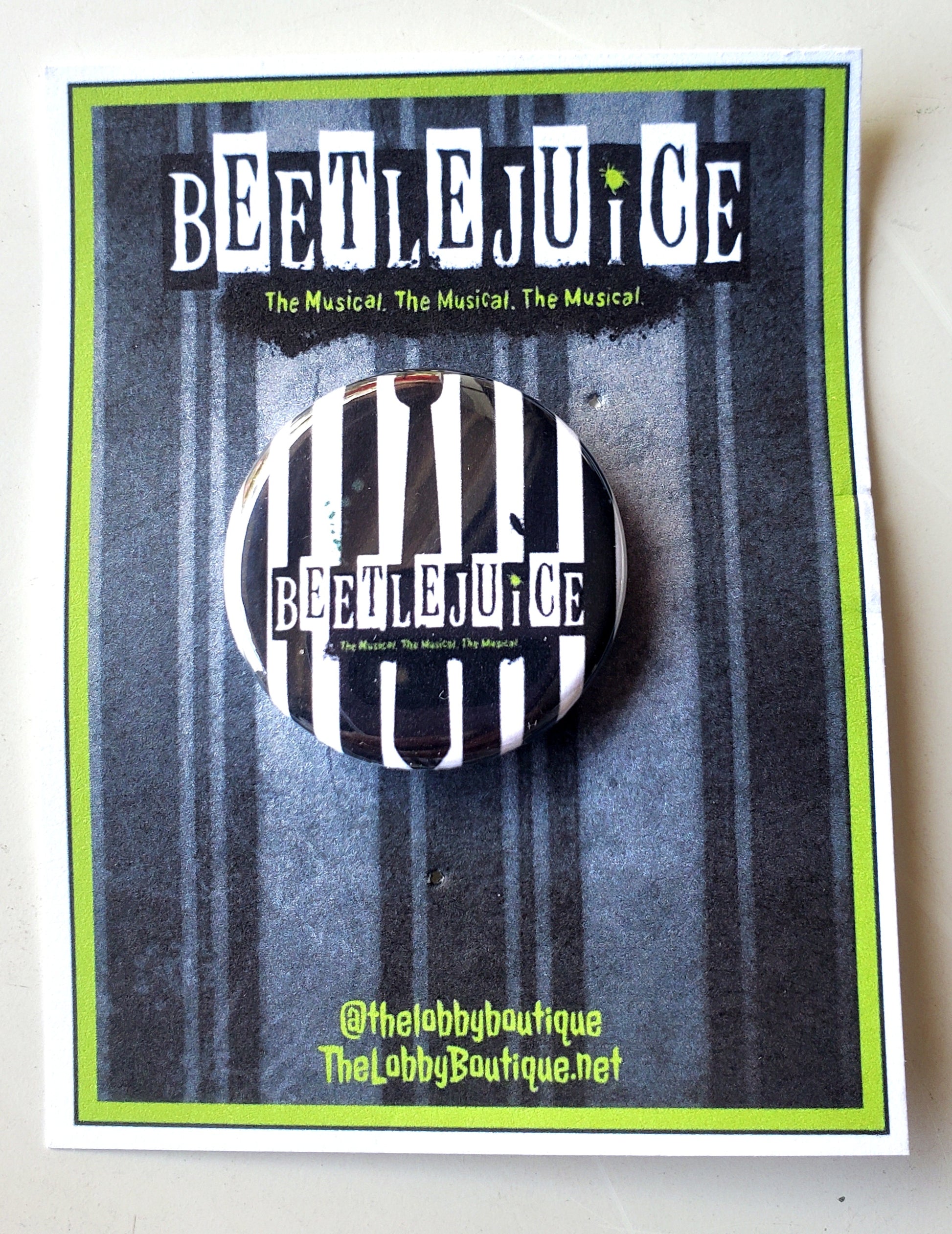 Inspired by the hit musical "BEETLEJUICE," the musical, this metal pinback button features a colorful show logo graphic. It makes the perfect cast gift, or for performers at the stage door, or as a unique memento for opening night or a final performance. The pin measures 1.25 inches across and it comes attached to an originally designed card, packaged and ready for gift-giving or display.