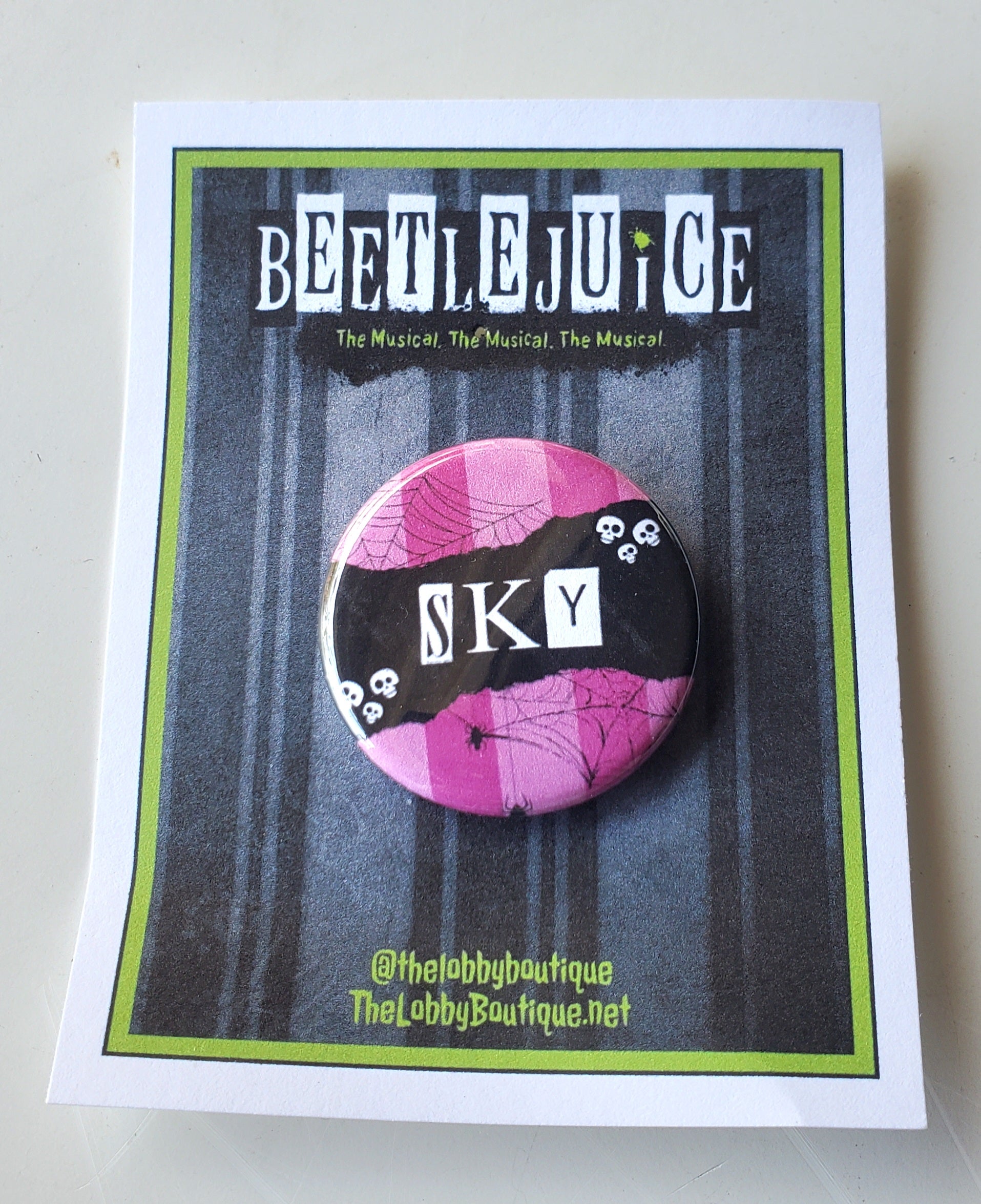 Inspired by the hit musical "BEETLEJUICE," the musical, this metal pinback button features the Girl Scout, "SKY." This item makes a perfect cast gift, stage door gift or memento for opening night or a final performance. The pin measures 1.25 inches across and it comes attached to an originally designed card, packaged and ready for gift-giving or display.