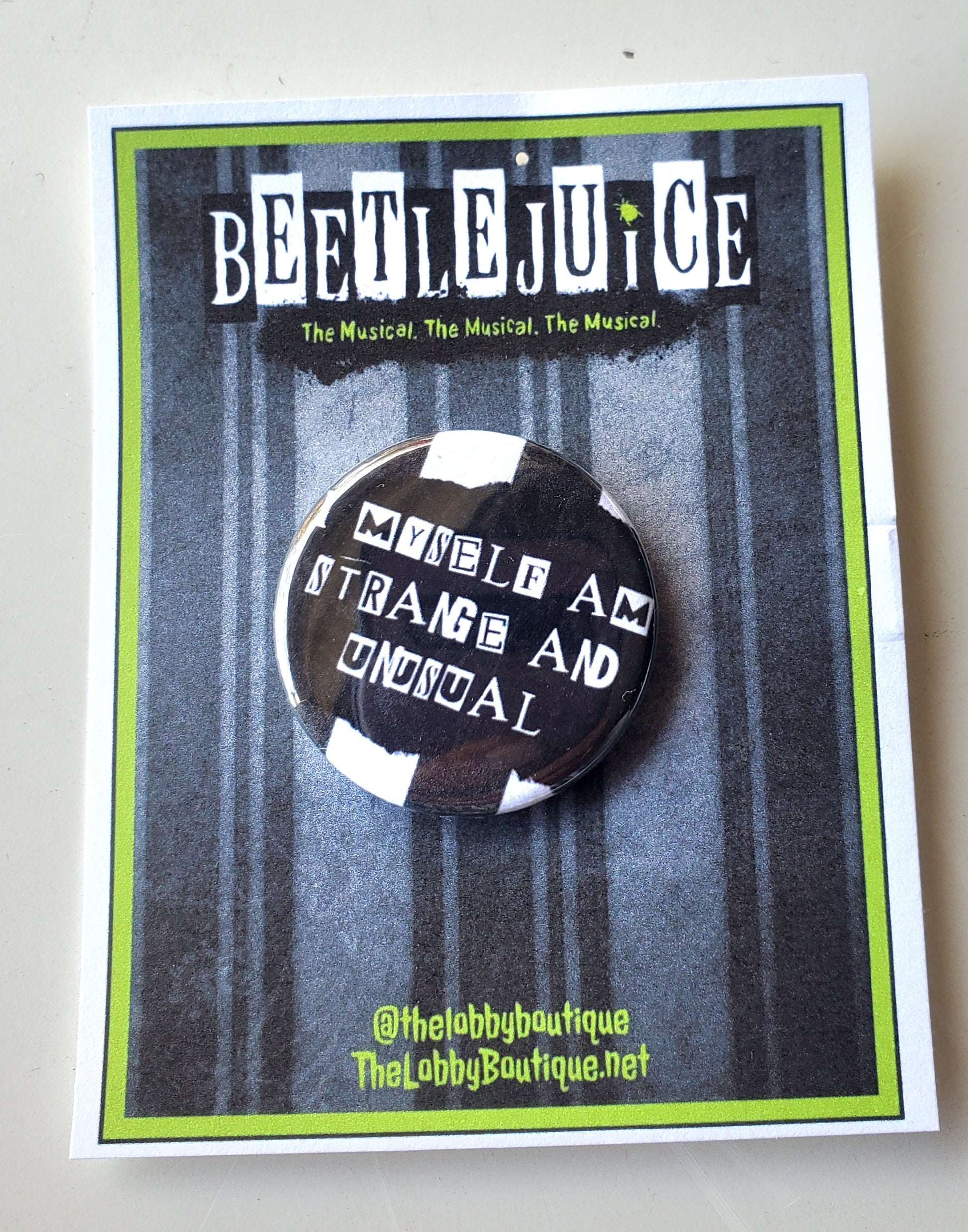 Inspired by the hit musical "BEETLEJUICE," the musical, this metal pinback button features the line "I Myself Am Strange and Unusual." This item makes a perfect cast gift, stage door gift or memento for opening night or a final performance. The pin measures 1.25 inches across and it comes attached to an originally designed card, packaged and ready for gift-giving or display.