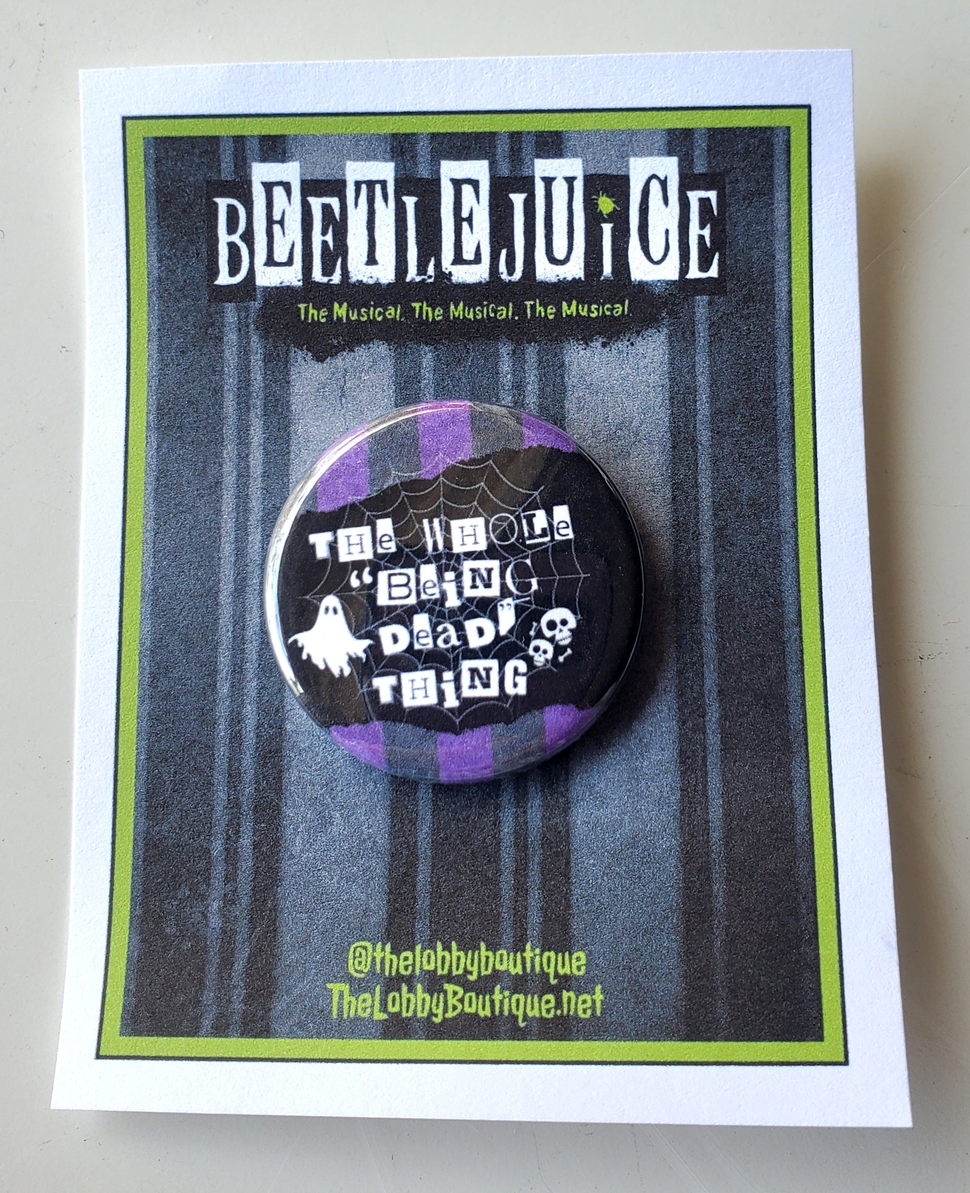 Inspired by the hit musical "BEETLEJUICE," the musical, this metal pinback button features the line "This Whole Being Dead Thing." It makes the perfect cast gift, or for performers at the stage door, or as a unique memento for opening night or a final performance. The pin measures 1.25 inches across and it comes attached to an originally designed card, packaged and ready for gift-giving or display.