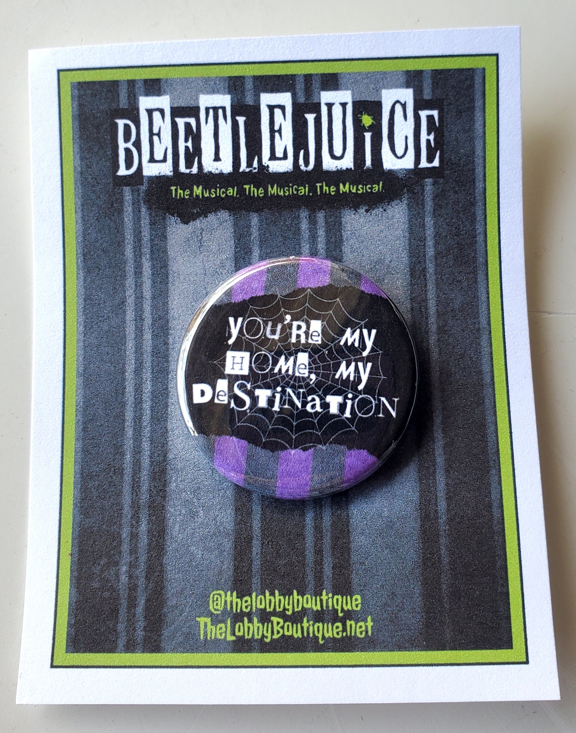 Inspired by the hit musical "BEETLEJUICE," the musical, this metal pinback button features the line "You're My Home, My Destination." It makes the perfect cast gift, or for performers at the stage door, or as a unique memento for opening night or a final performance. The pin measures 1.25 inches across and it comes attached to an originally designed card, packaged and ready for gift-giving or display.