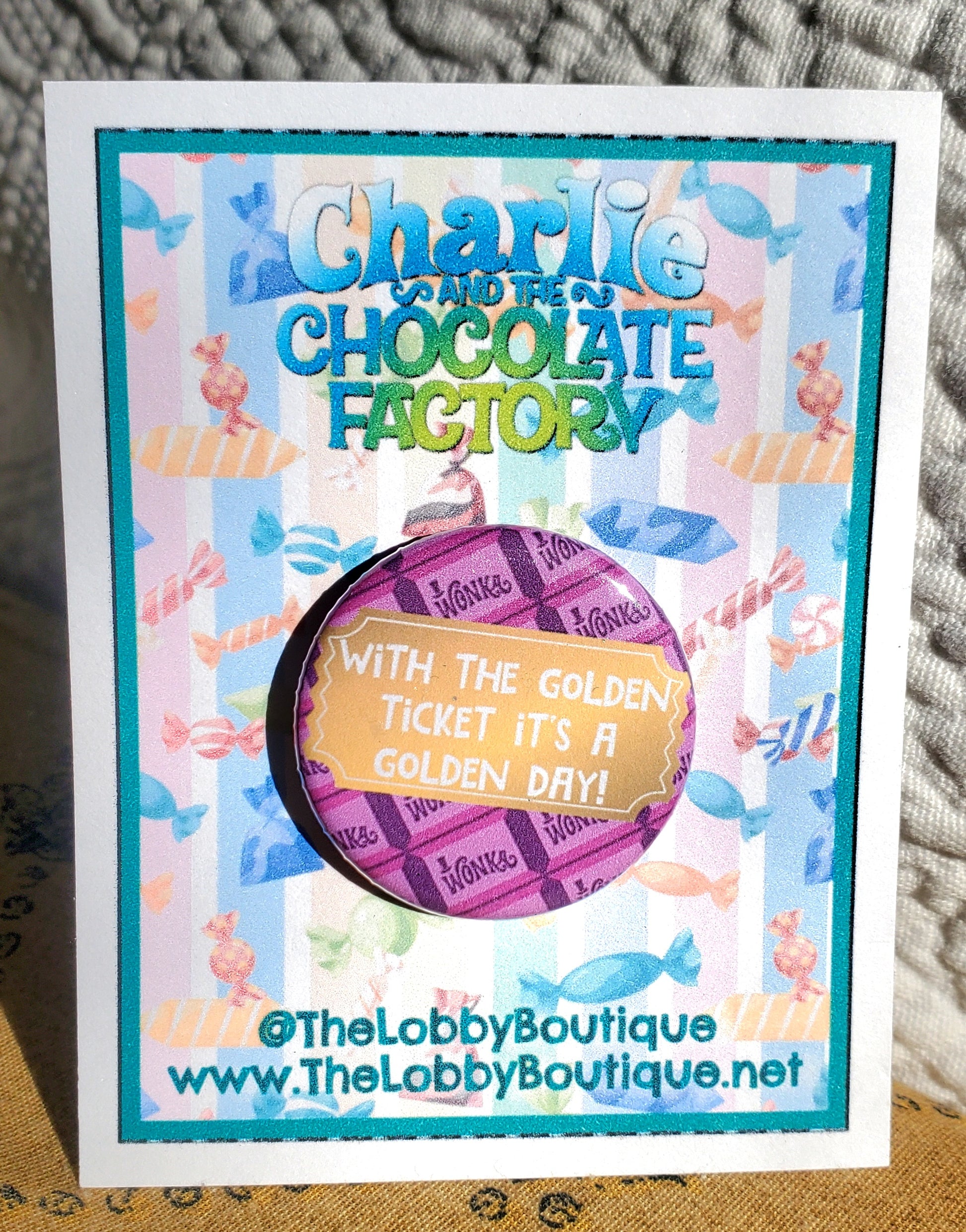 Inspired by CHARLIE AND THE CHOCOLATE FACTORY, the book, movie and musical, this metal pinback button features the phrase "With a Golden Ticket, it's a Golden Day!" graphic. It makes the perfect cast gift, for performers at a stage door, or as a unique memento for opening night or a final performance. It comes attached to an originally designed card and is packaged and ready for gift-giving or display.