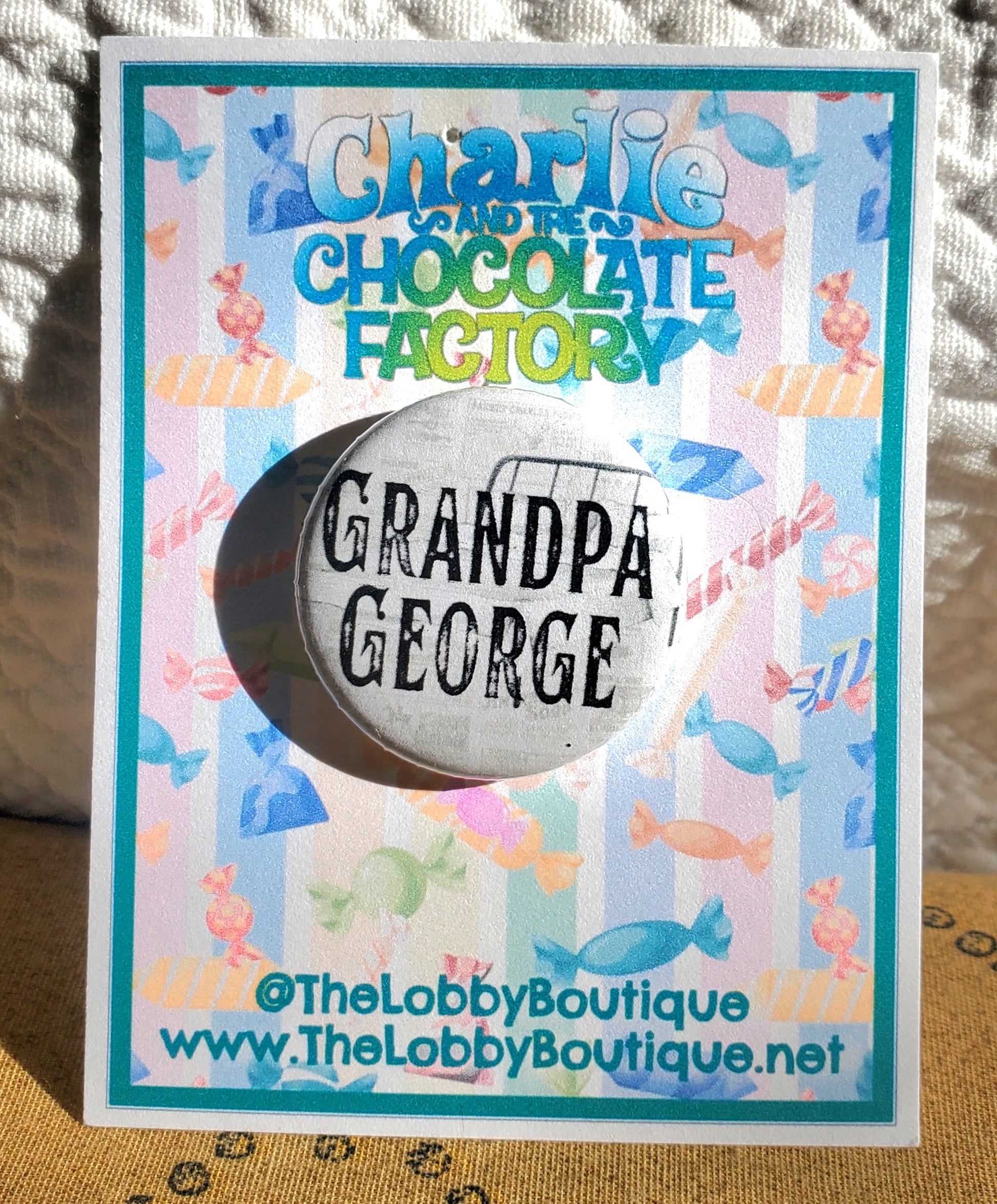 Inspired by CHARLIE AND THE CHOCOLATE FACTORY, the book, movie and musical, this metal pinback button features Charlie's "Grandpa George." It makes the perfect cast gift, for performers at a stage door, or as a unique memento for opening night or a final performance. It comes attached to an originally designed card and is packaged and ready for gift-giving or display.