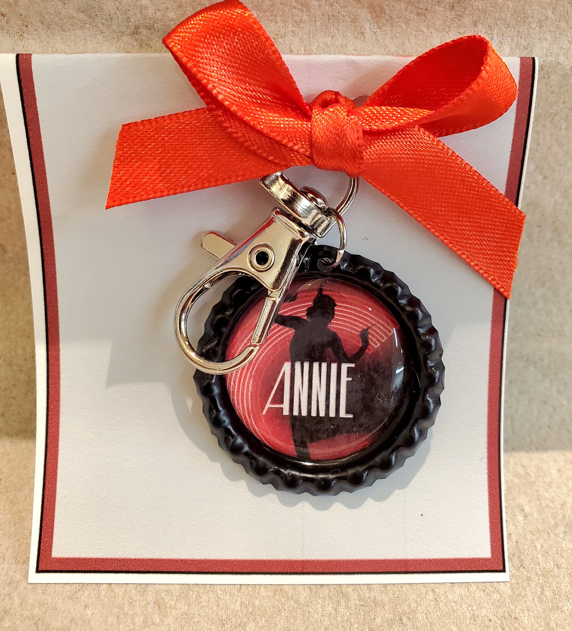 "Annie," one of the Merry Murderesses, is featured on this bottlecap keychain. It makes the perfect gift for your cast, for performers at a stage door, or as a unique memento for opening night or a final performance. The bottlecap measures one inch in diameter and is attached to a silver metal one inch long swivel clasp. It is packaged and ready for gift-giving or display.