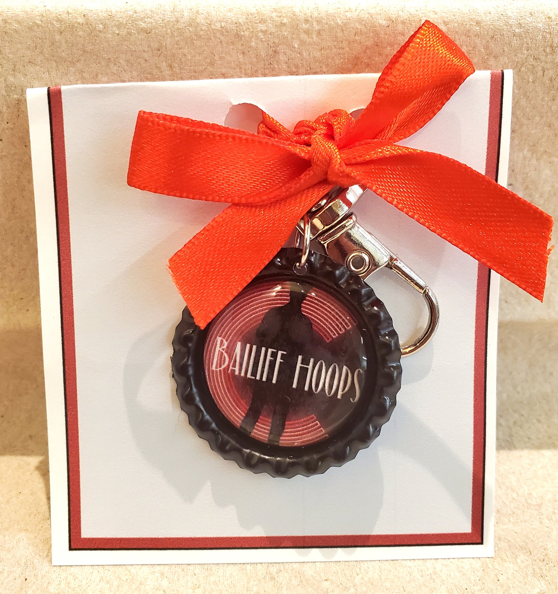 "Bailiff Hoops," is featured on this bottlecap keychain. It makes the perfect gift for your cast, for performers at a stage door, or as a unique memento for opening night or a final performance. The bottlecap measures one inch in diameter and is attached to a silver metal one inch long swivel clasp. It is packaged for easy display and gift-giving.