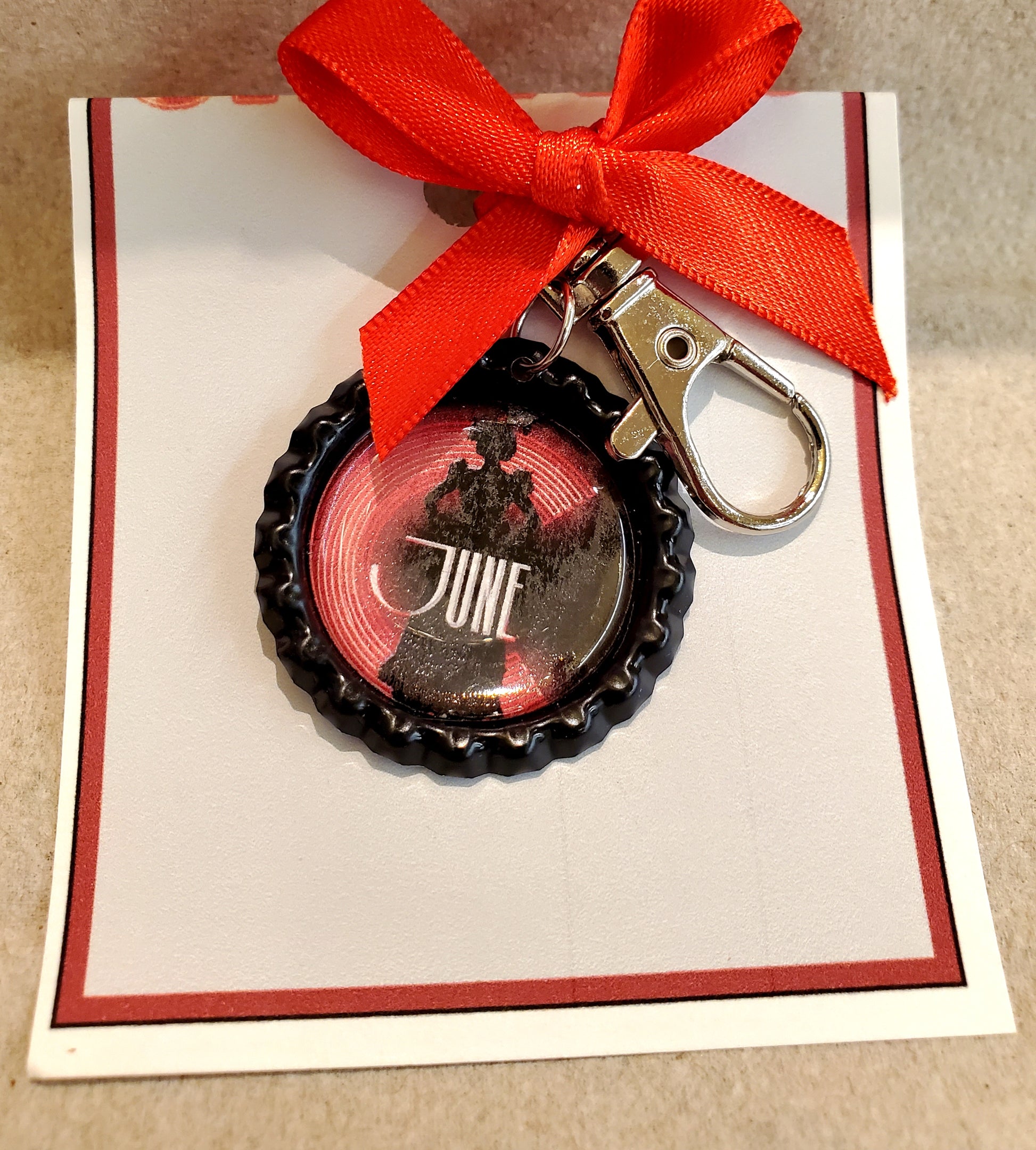 "June," one of the Merry Murderesses, is featured on this bottlecap keychain. It makes the perfect gift for your cast, for performers at a stage door, or as a unique memento for opening night or a final performance. The bottlecap measures one inch in diameter and is attached to a silver metal one inch long swivel clasp. It comes packaged for easy display and gift-giving.