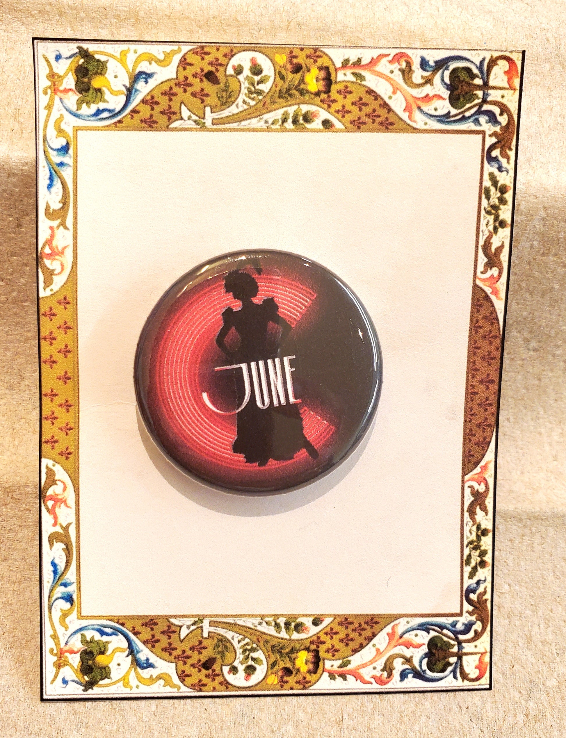 "June," one of the Merry Murderesses, is featured on this pin. It makes the perfect gift for your cast, for performers at a stage door, or as a unique memento for opening night or a final performance. The pin is 1.25 inch in circumference and comes packaged for easy display and gift-giving.