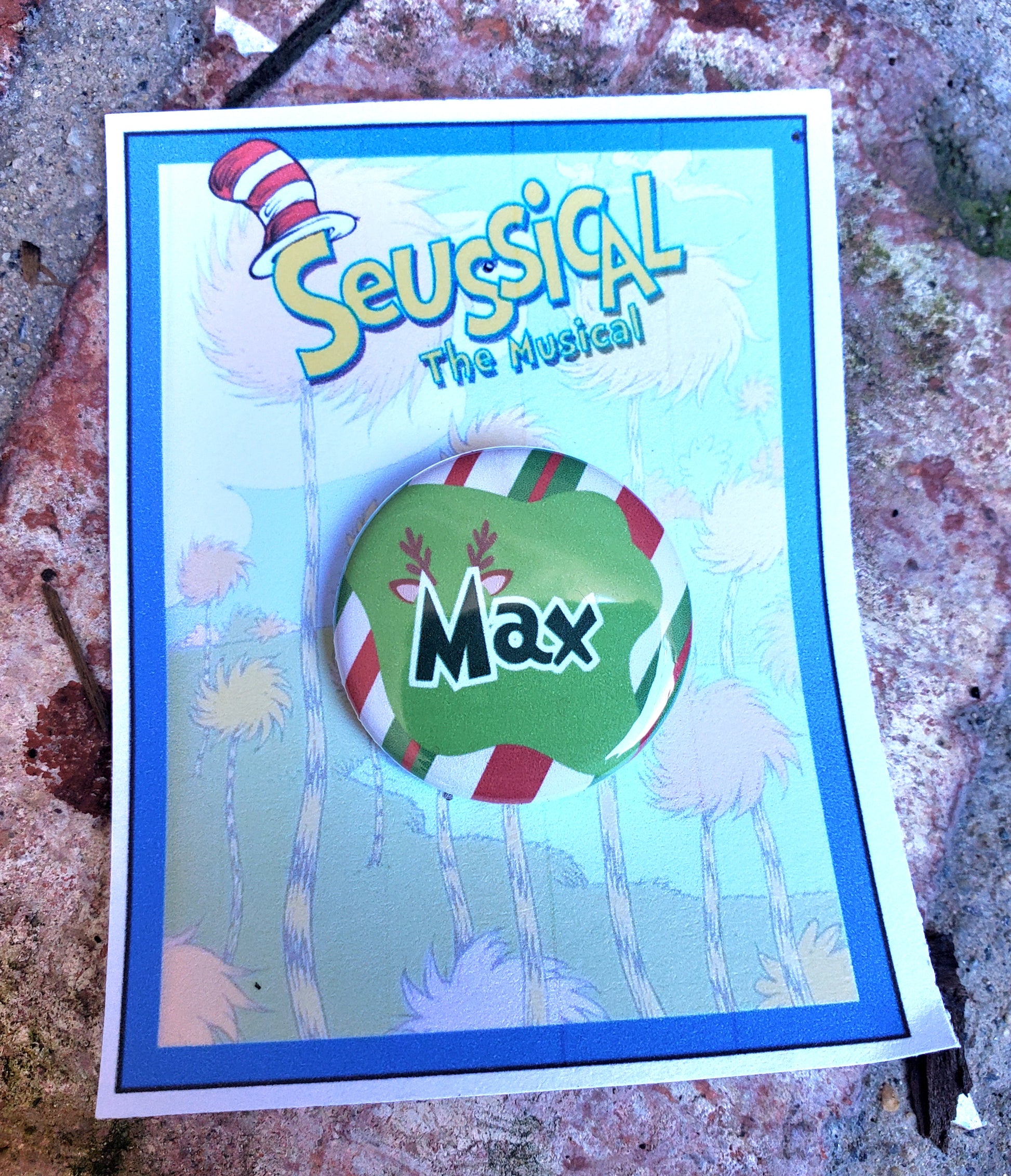 "Max" the Grinch's longsuffering pet, from the Dr. Seuss stories, is featured on this pin. It makes the perfect gift for your cast, for performers at a stage door, or as a unique memento for opening night or a final performance. The pin is 1.25 inch in circumference and comes on a card for easy display and gift-giving.