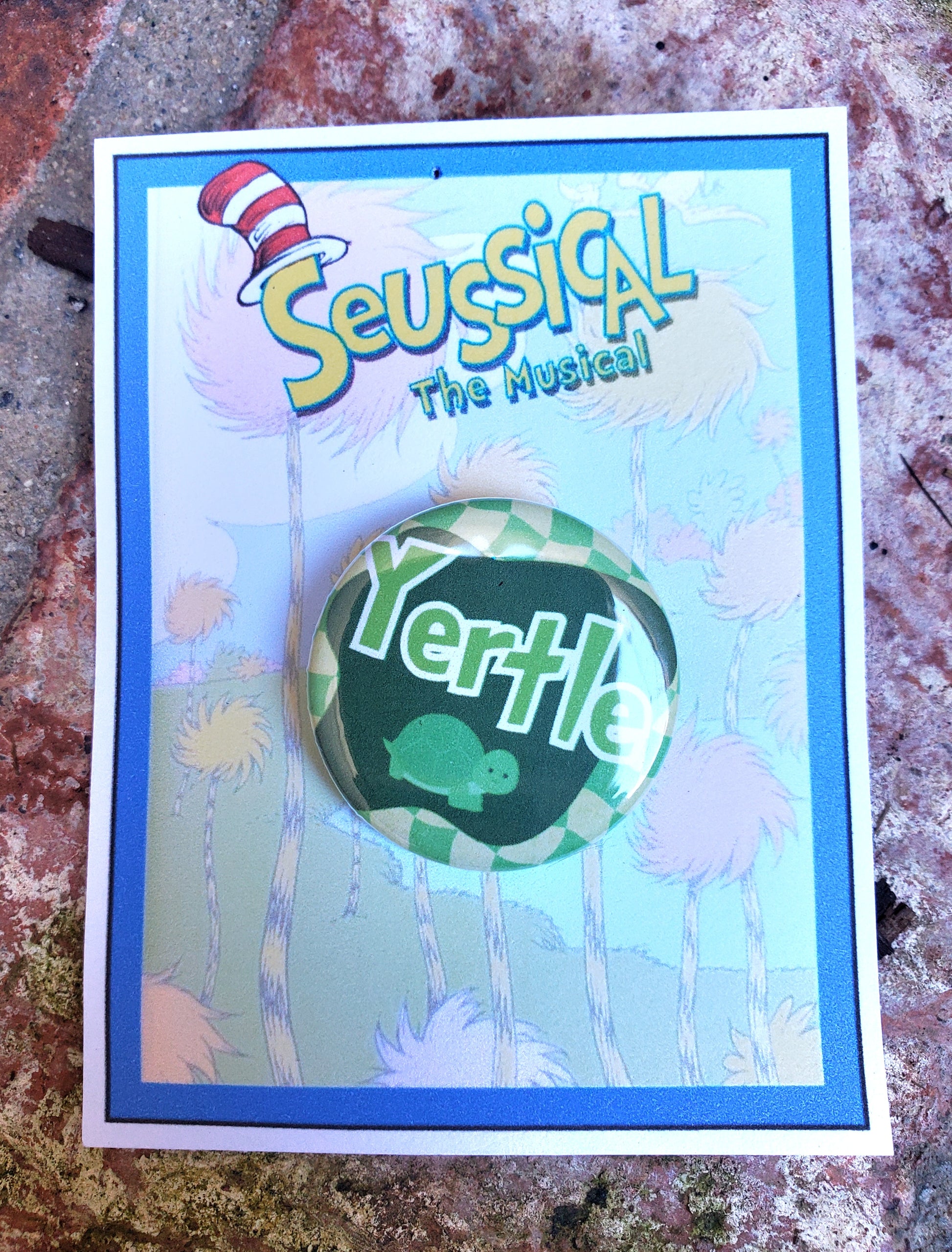 "Yertle the Turtle," from the Dr. Seuss stories, is featured on this pin. It makes the perfect gift for your cast, for performers at a stage door, or as a unique memento for opening night or a final performance. The pin is 1.25 inch in circumference and comes on a card for easy display and gift-giving.