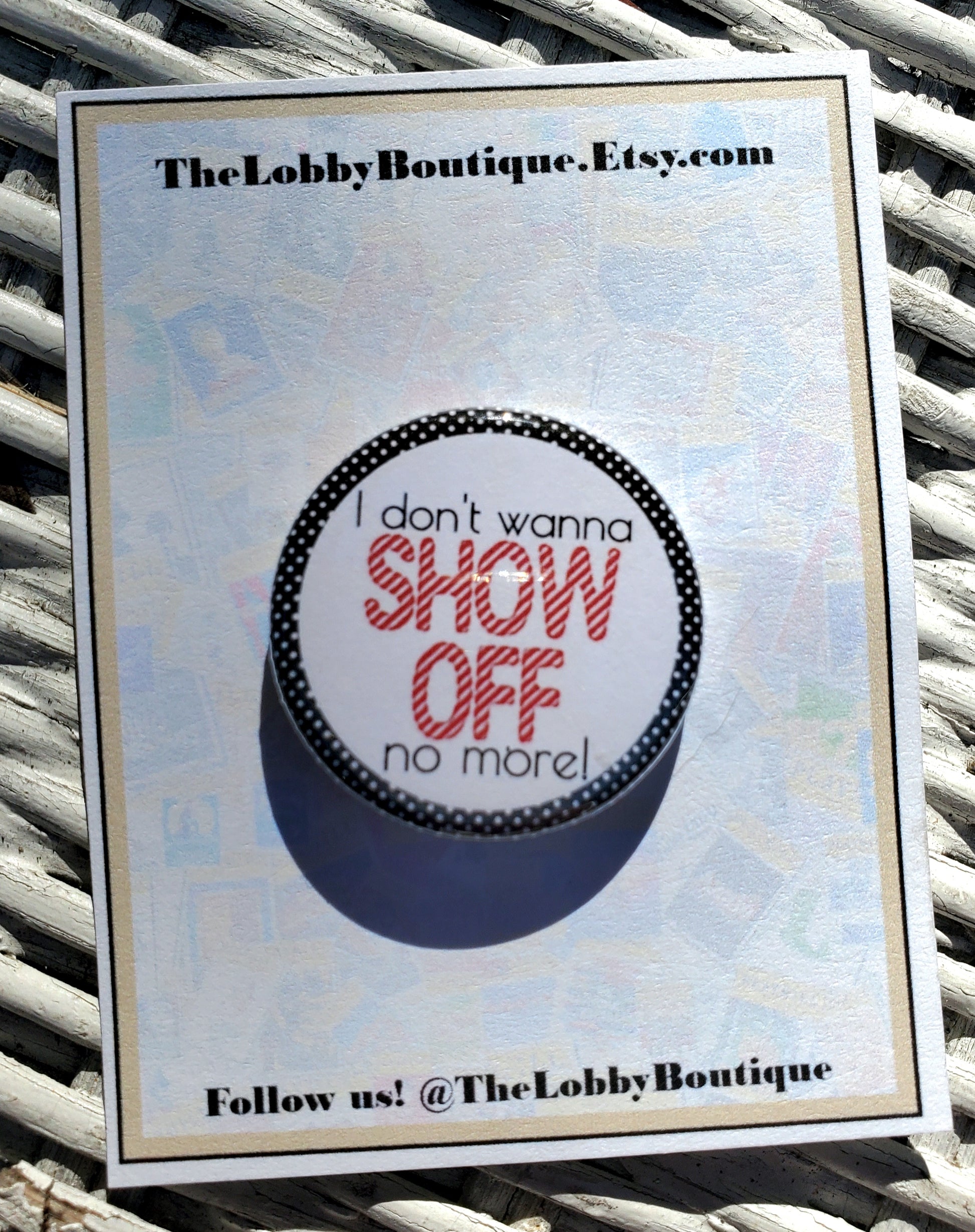 Janet's adorable lament "I Don't Want to Show Off No More" is featured on this pin. It makes the perfect gift for your cast, for performers at a stage door, or as a unique memento for opening night or a final performance. It is packaged and ready for gift-giving or display.
