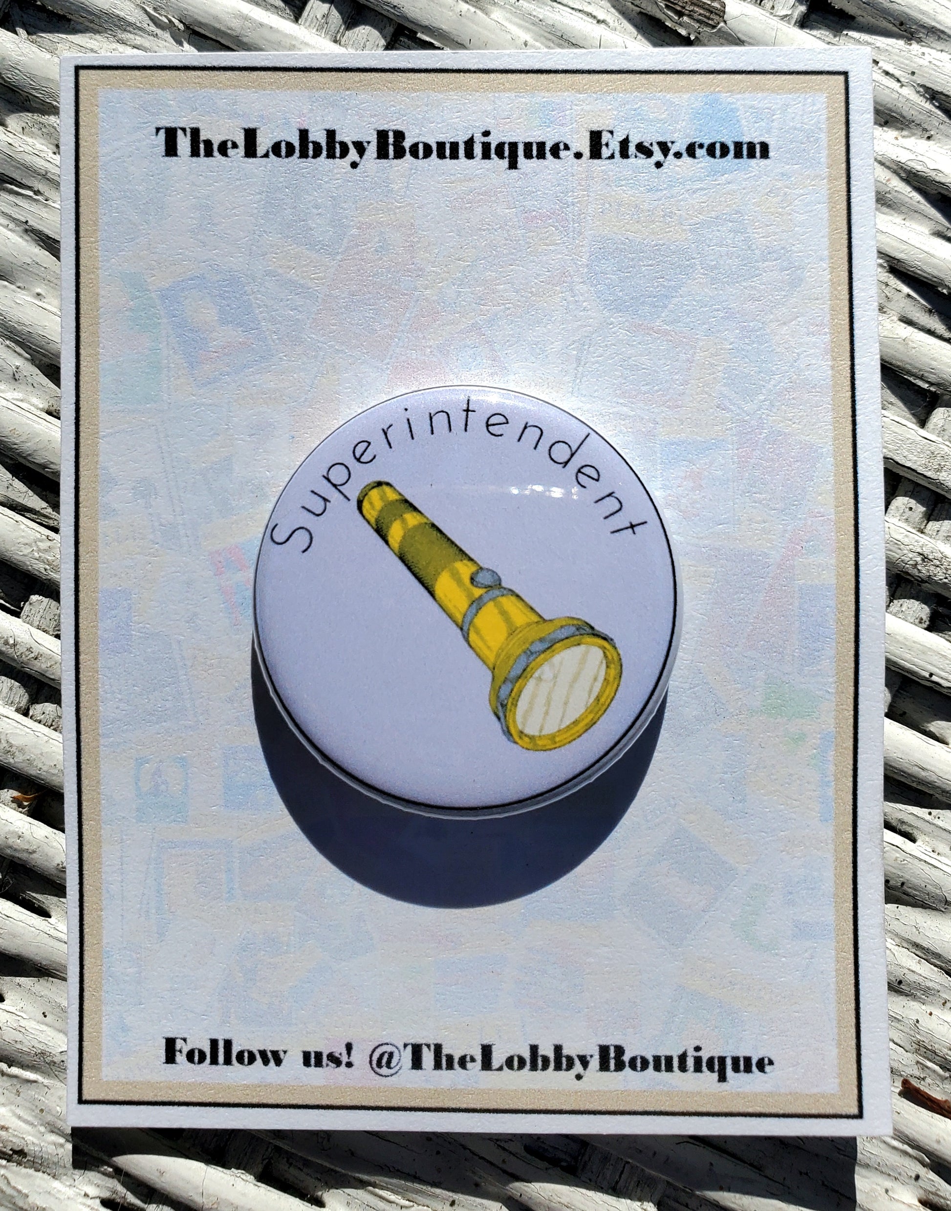 The "Superintendent" is featured on this pin. It makes the perfect gift for your cast, for performers at a stage door, or as a unique memento for opening night or a final performance. It is packaged and ready for gift-giving or display.