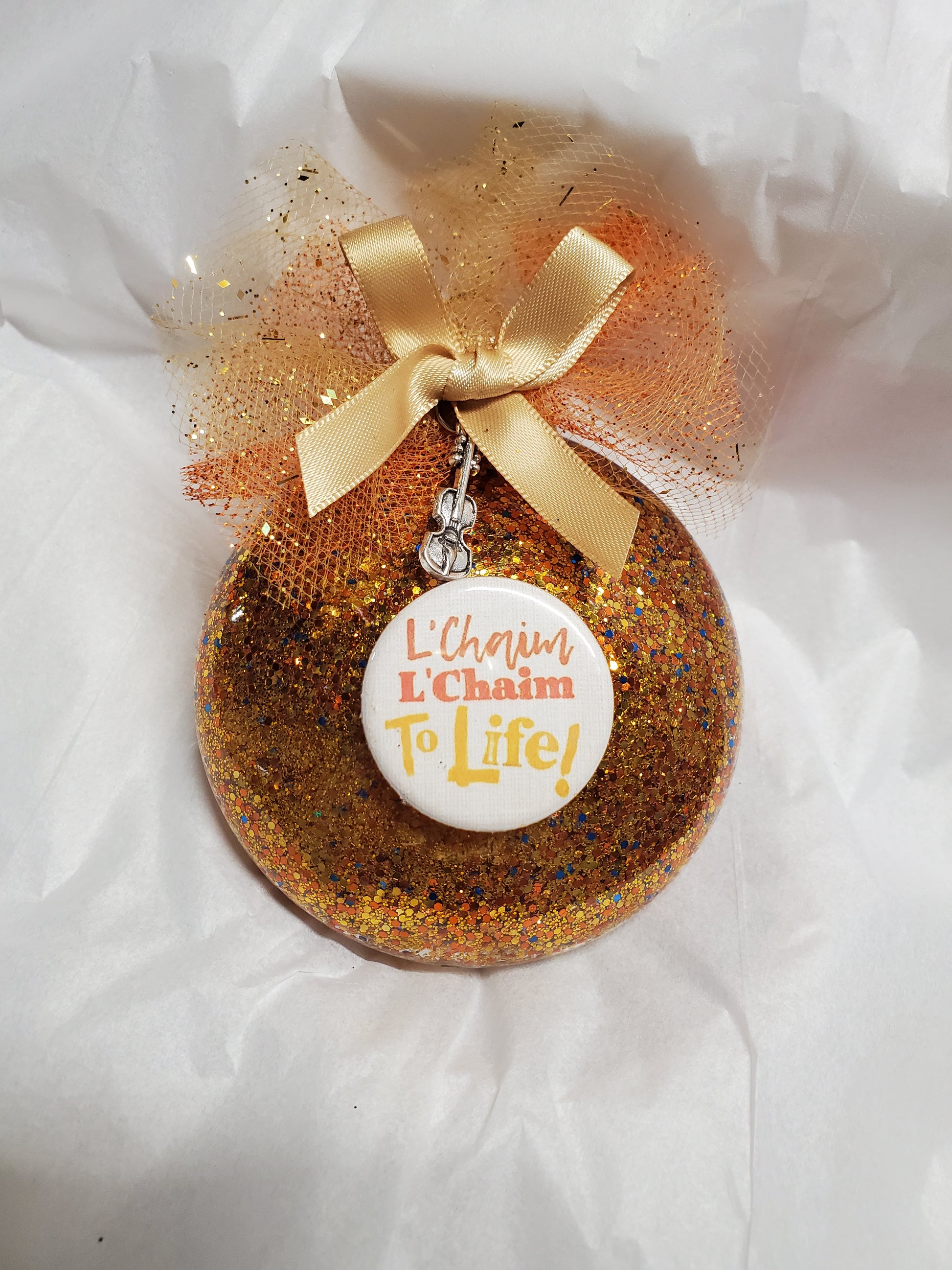 This Christmas ornament features a "L'CHAIM, L'CHAIM" graphic from the musical FIDDLER ON THE ROOF. It makes the perfect gift for your cast, for performers at a stage door, or as a unique memento for opening night or a final performance. It is packaged and ready for gift-giving or display.