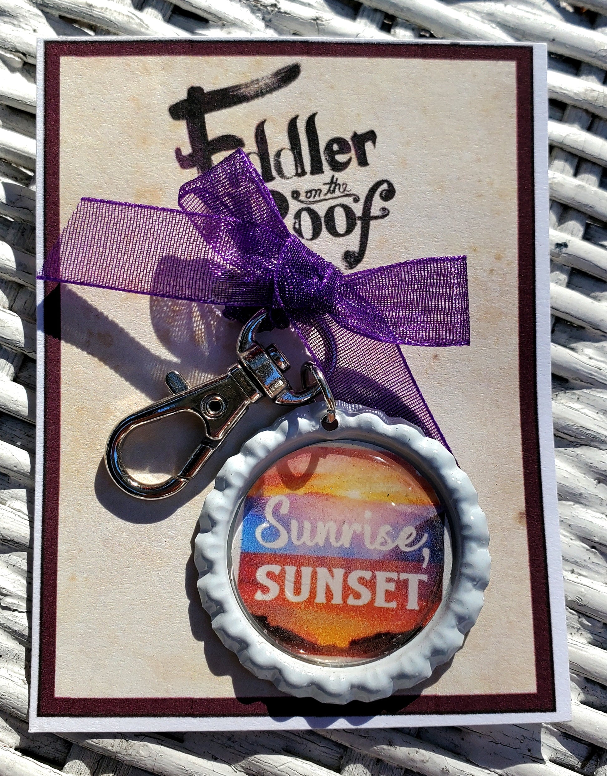 "Sunrise, Sunset" from Fiddler on the Roof is featured on this bottlecap keychain. It makes the perfect gift for your cast, for performers at a stage door, or as a unique memento for opening night or a final performance. The bottlecap is one inch in circumference, comes attached to a silver metal swivel clasp and is packaged on a card for easy display and gift-giving.