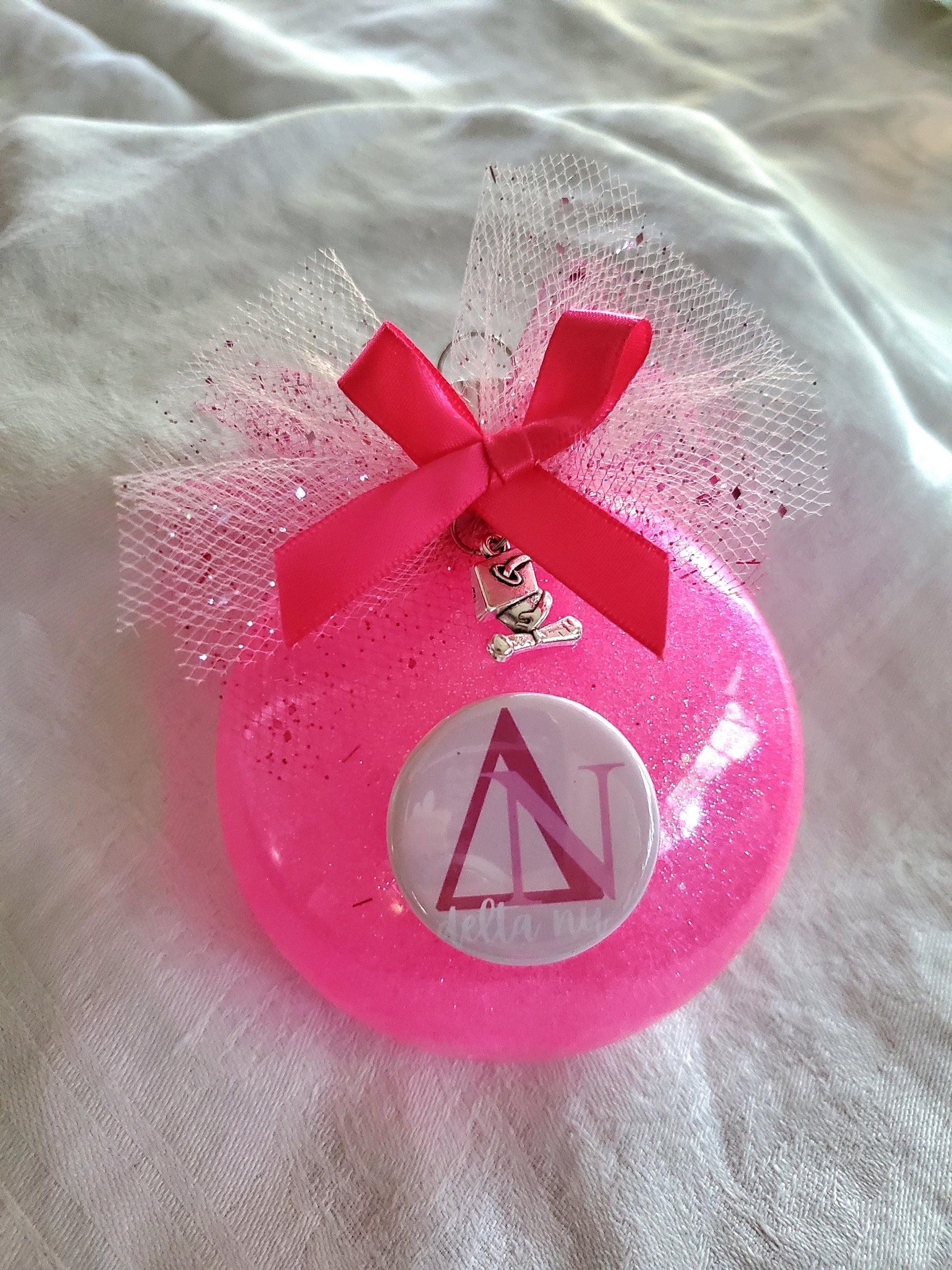 This Christmas ornament features a "DELTA NU" graphic from the famous sorority in Legally Blonde. It makes the perfect gift for your cast, for performers at a stage door, or as a unique memento for opening night or a final performance. It is packaged and ready for gift-giving or display.