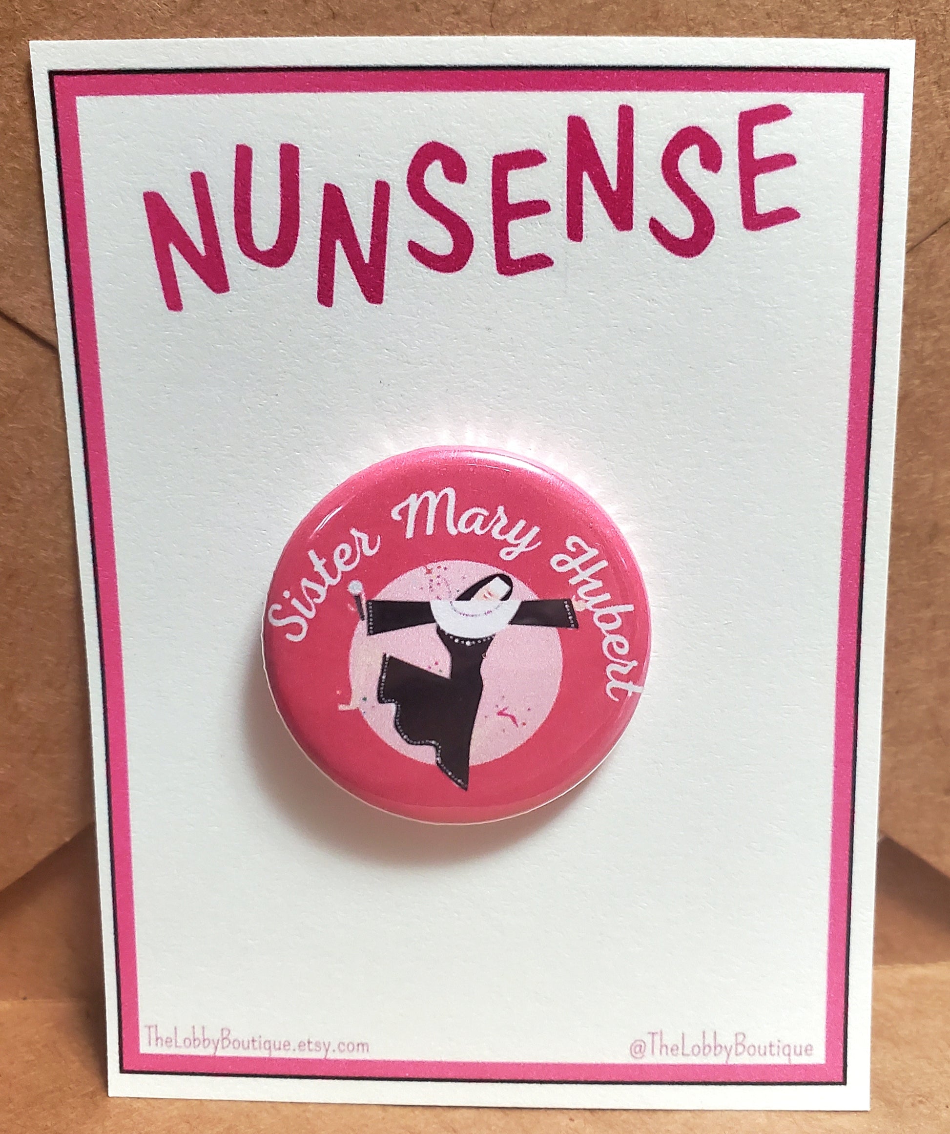 Sister Mary Hubert is featured on this pin. It makes the perfect gift for your cast, for performers at a stage door, or as a unique memento for opening night or a final performance. It is packaged and ready for gift-giving or display.