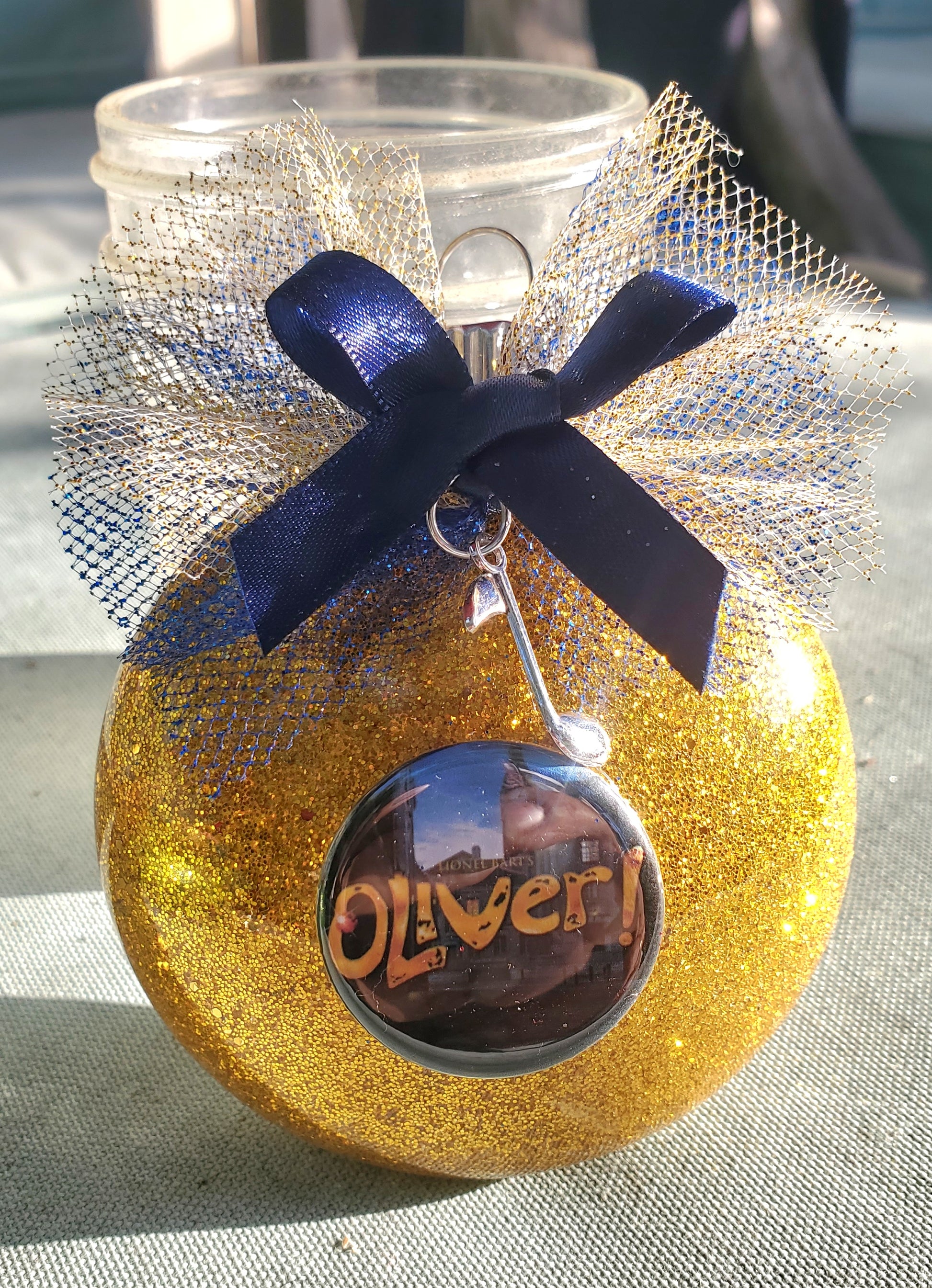 This Christmas ornament features an "OLIVER" graphic, inspired by the book and musical. It makes the perfect gift for your cast, for performers at a stage door, or as a unique memento for opening night or a final performance. It is packaged and ready for gift-giving or display.