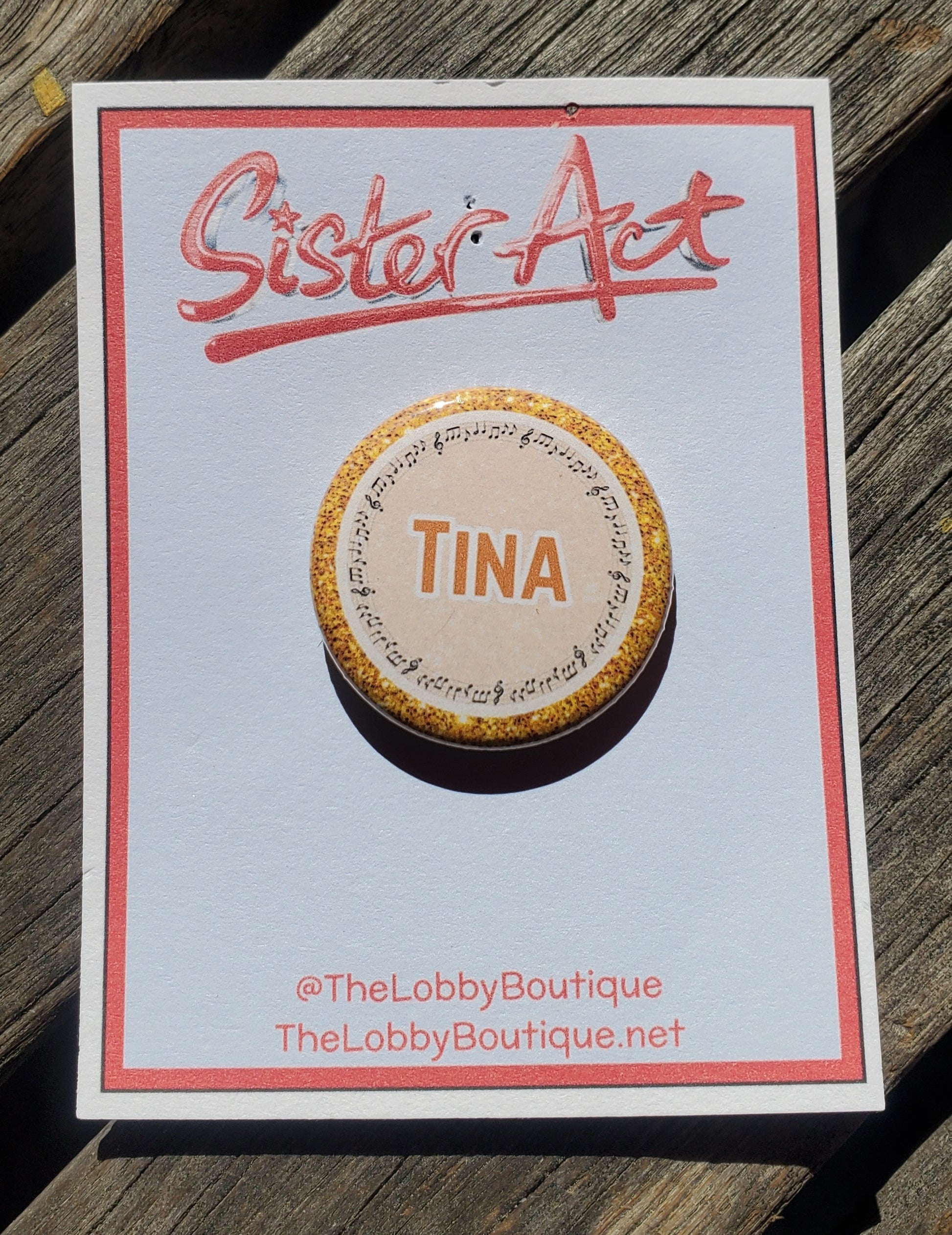 Inspired by SISTER ACT, the movie and musical, this metal pinback button features "TINA." It makes the perfect cast gift, or for performers at the stage door, or as a unique memento for opening night or a final performance. The pin measures 1.25 inches across and it comes attached to an originally designed card, packaged and ready for gift-giving or display.