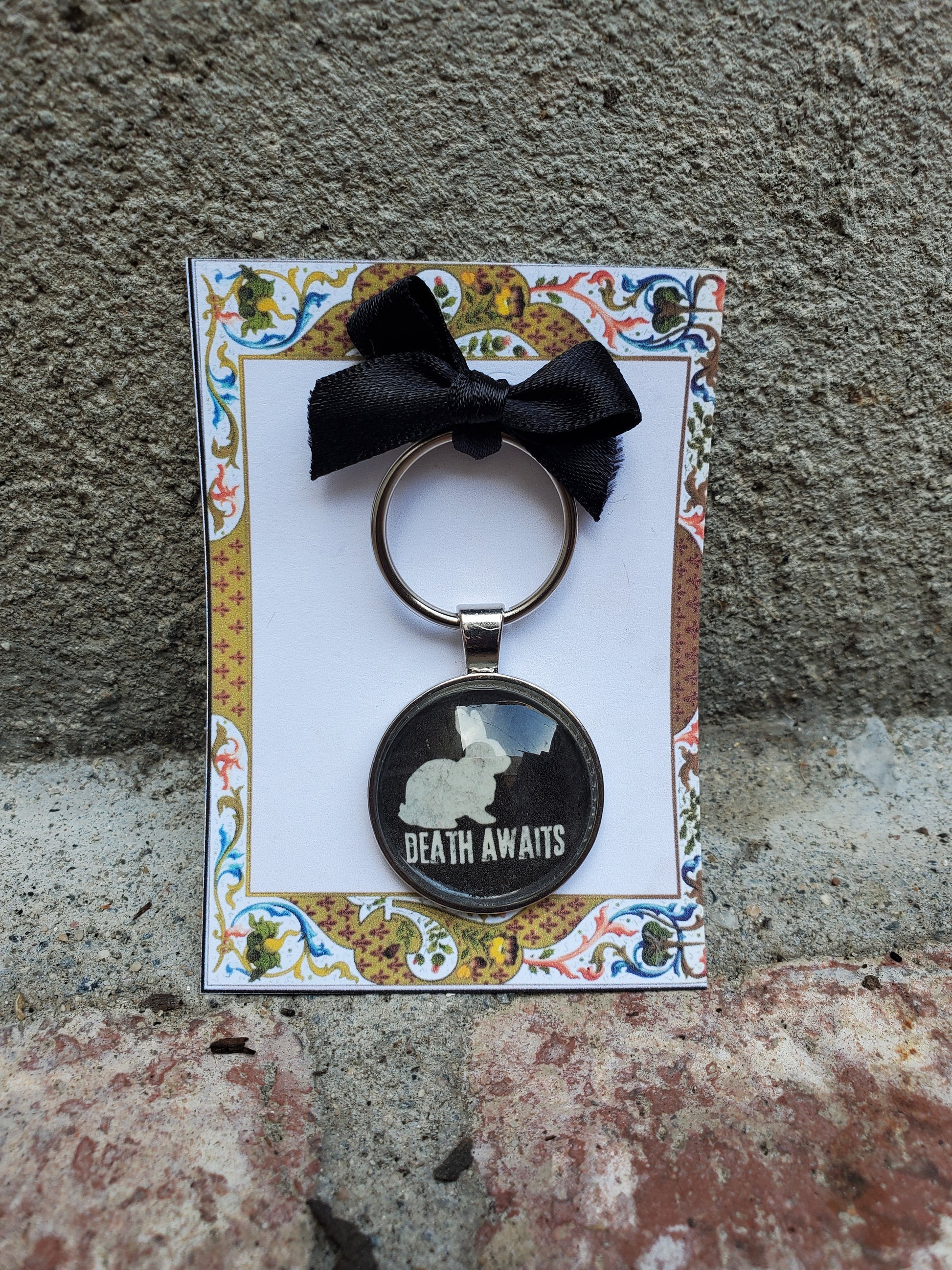 "Death Awaits," along with a little white bunny rabbit, is featured on this glass cabachon keychain. It makes the perfect gift for your cast, for performers at a stage door, or as a unique memento for opening night or a final performance. It is packaged and ready for gift-giving or display.
