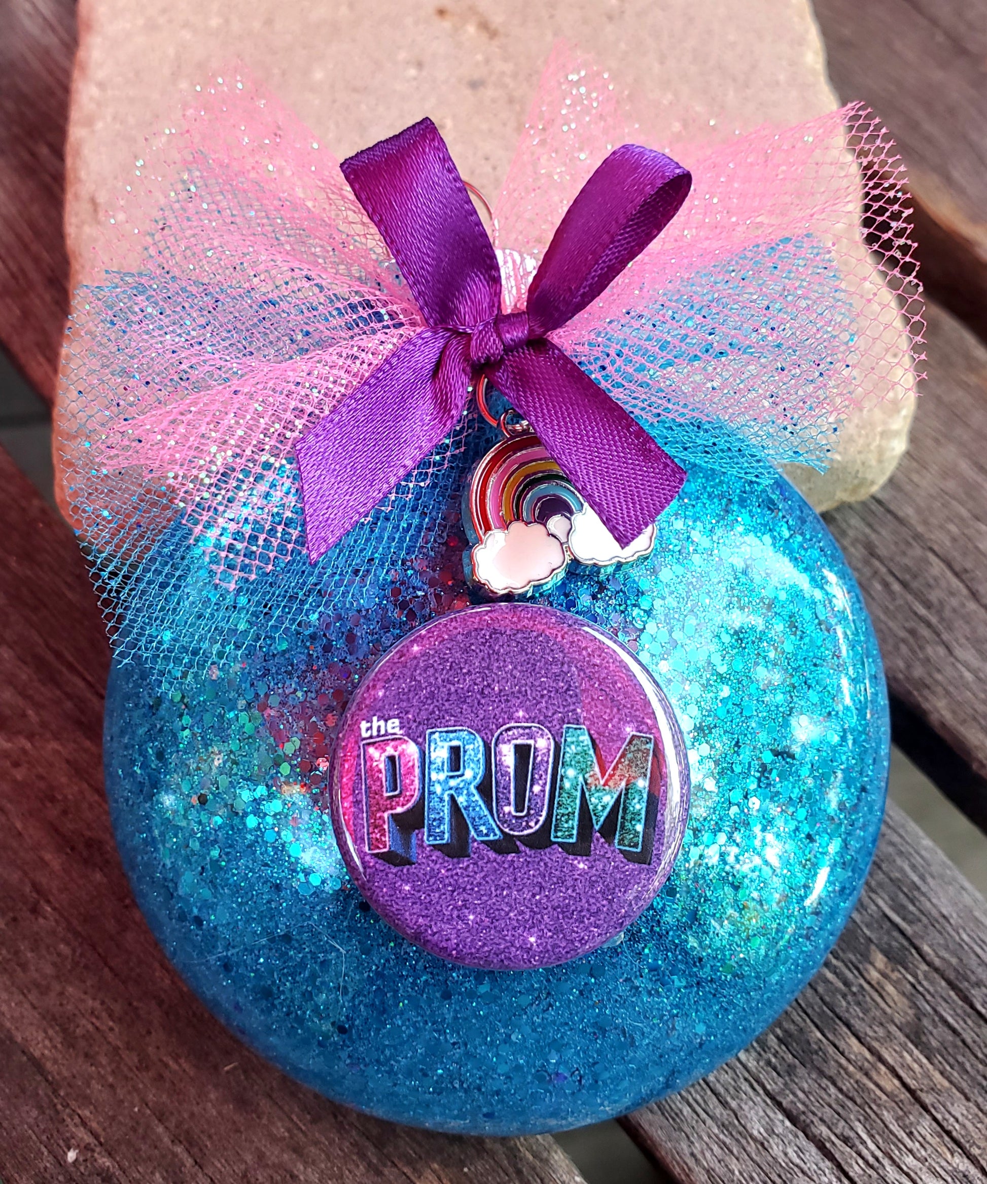 A layer of verathane and glitter coat the inside of the ornament and it is finished off with a glitter tulle bow and embellished with a rainbow charm. The clear acrylic ornament is a "flattened disc" in shape, 3 inches in circumference and 1.5 inches deep.