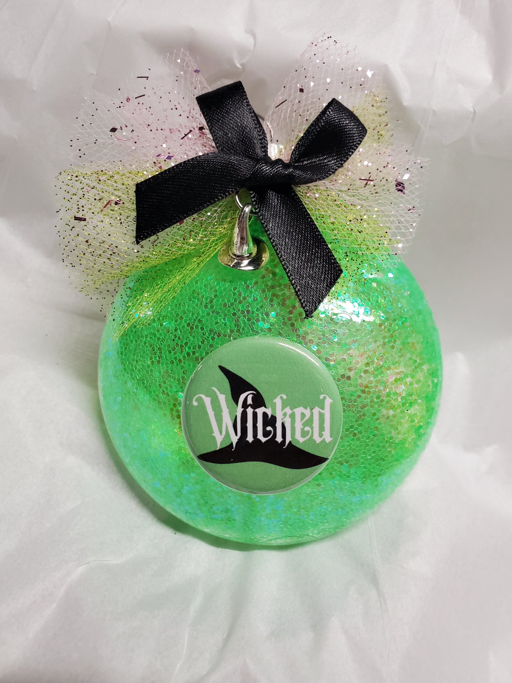 This Christmas ornament features a "WICKED" graphic. It makes the perfect gift for your cast, for performers at a stage door, or as a unique memento for opening night or a final performance. It is packaged and ready for gift-giving or display.