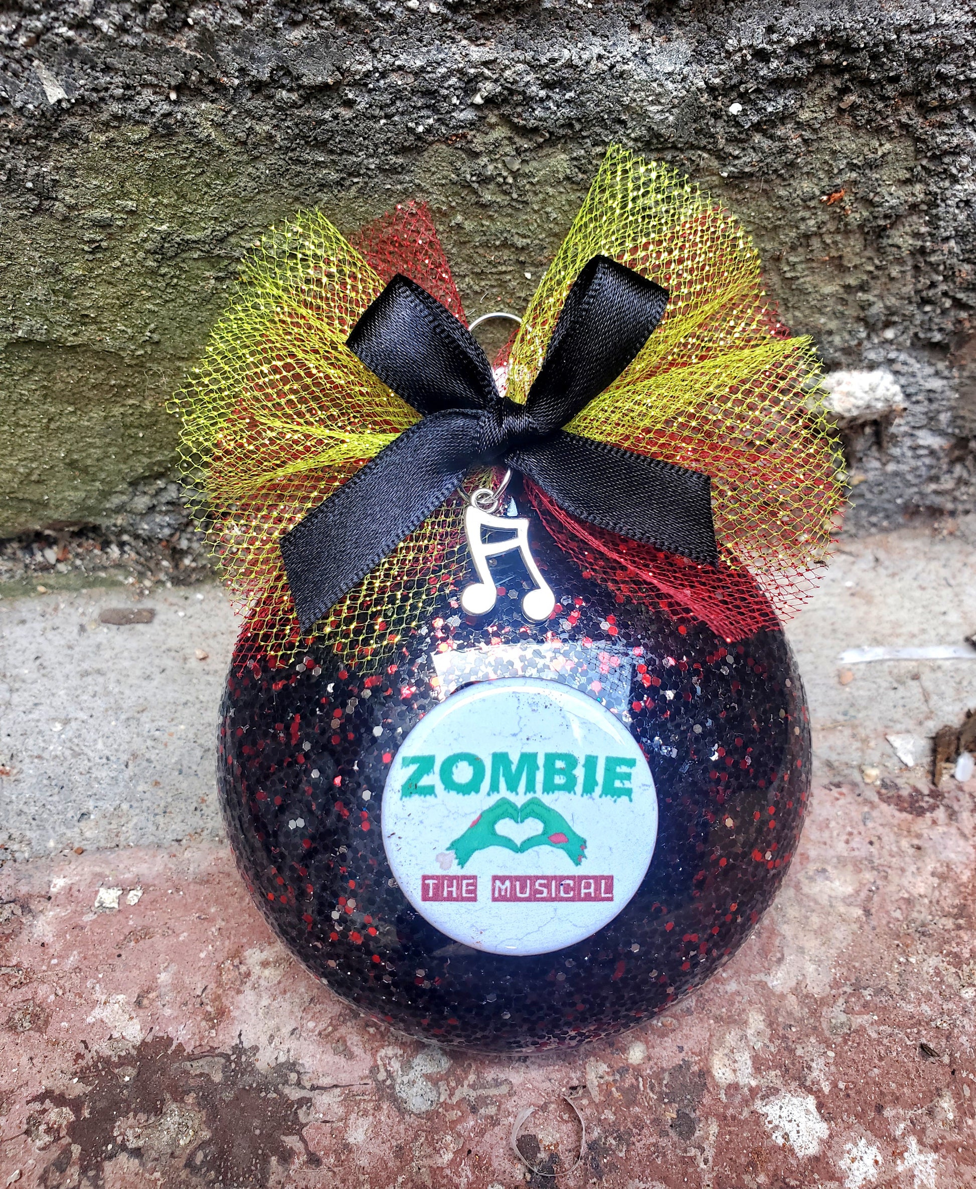 This Christmas ornament features a "ZOMBIE THE MUSICAL" graphic. It makes the perfect gift for your cast, for performers at a stage door, or as a unique memento for opening night or a final performance. It is packaged and ready for gift-giving or display.